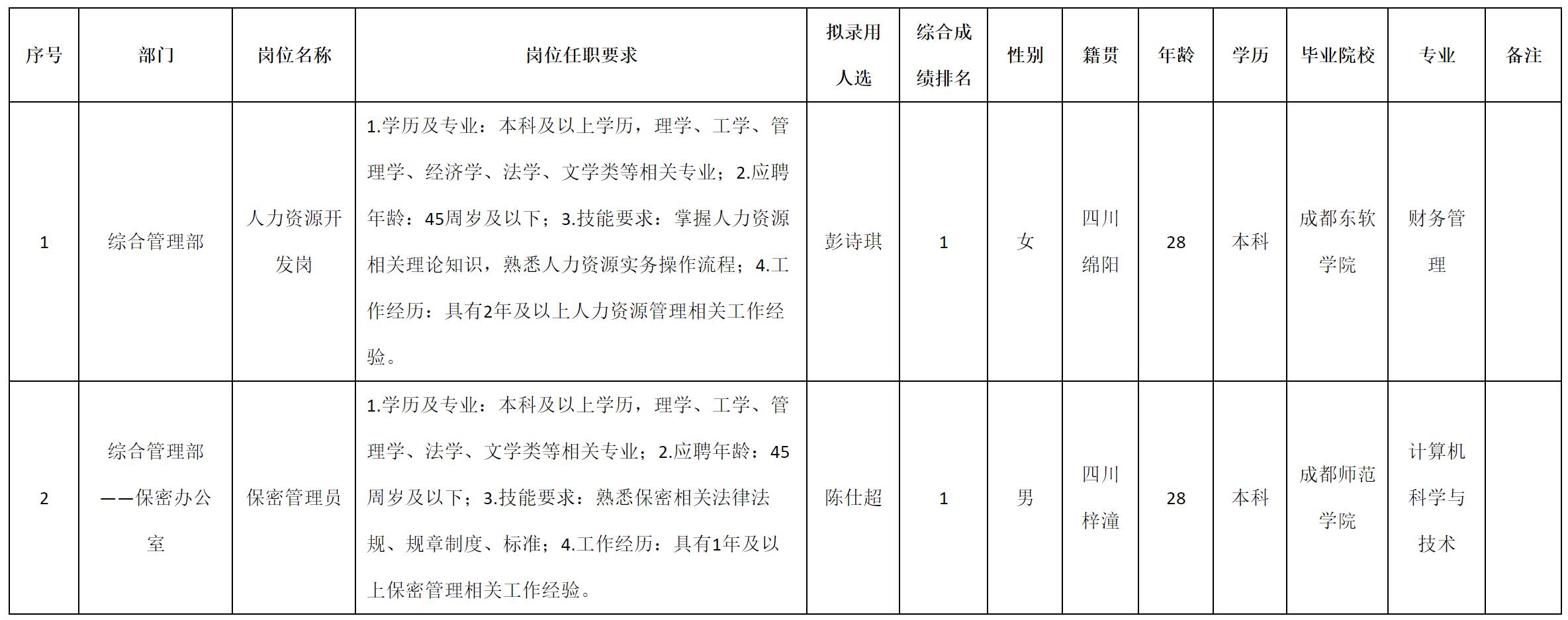 根据四川九强通信科技有限公司发布的招聘公告及招聘相关规定,经测试、考察、体检等程序,拟录用彭诗琪等2名同志到四川九强通信科技有限公司工作,现予以公示,具体情况如下: