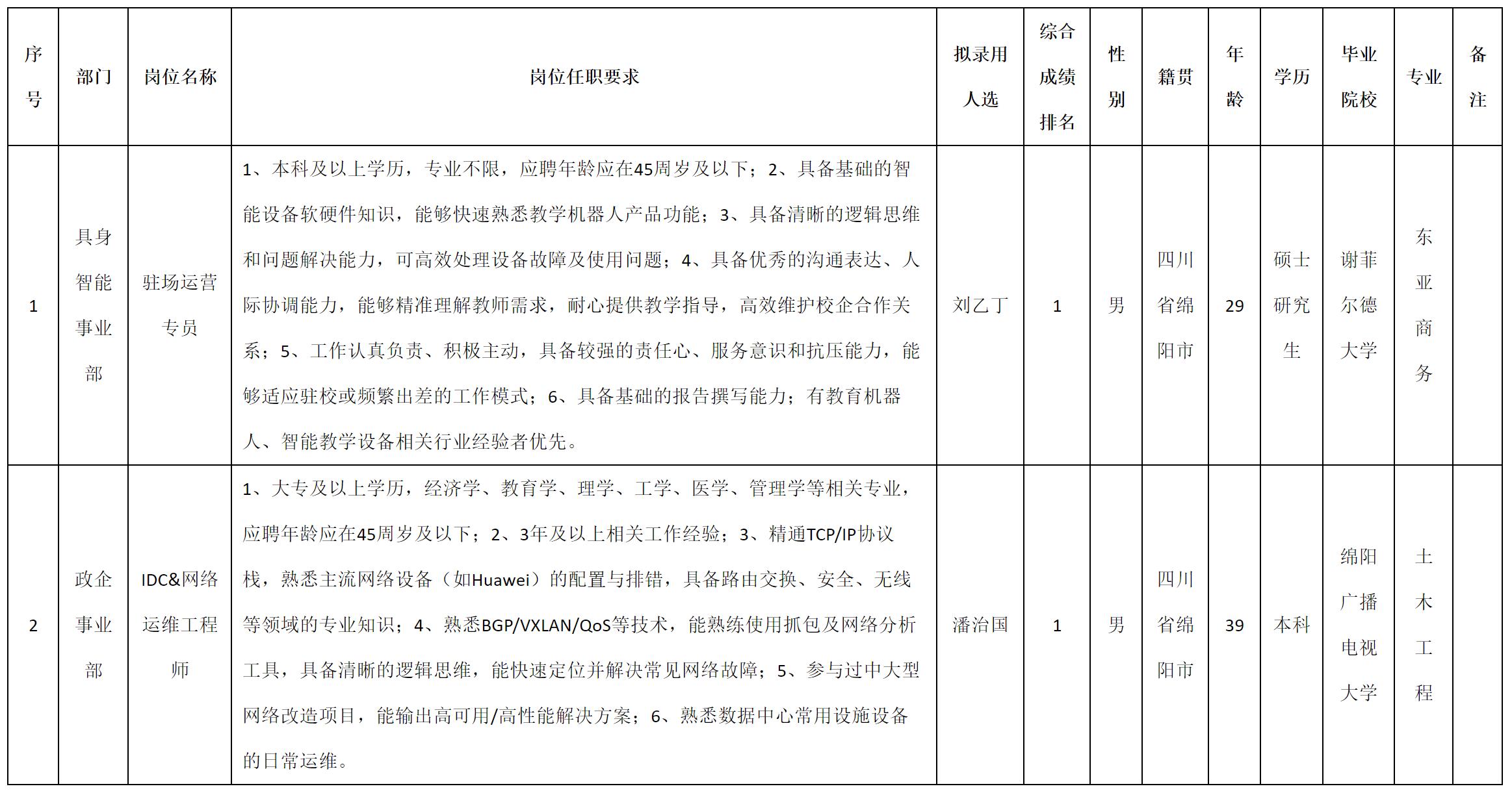 根据四川九洲投资控股集团有限公司软件与数据智能产业发布的招聘公告及招聘相关规定,经测试、考察、体检等程序,拟录用刘乙丁等2名同志到四川九洲投资控股集团有限公司软件与数据智能产业工作,现予以公示,具体情况如下: