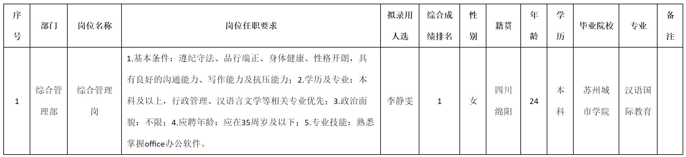 根据四川九洲防控科技有限责任公司发布的招聘公告及招聘相关规定,经测试、考察、体检等程序,拟录用李静雯同志到四川九洲防控科技有限责任公司工作,现予以公示,具体情况如下: