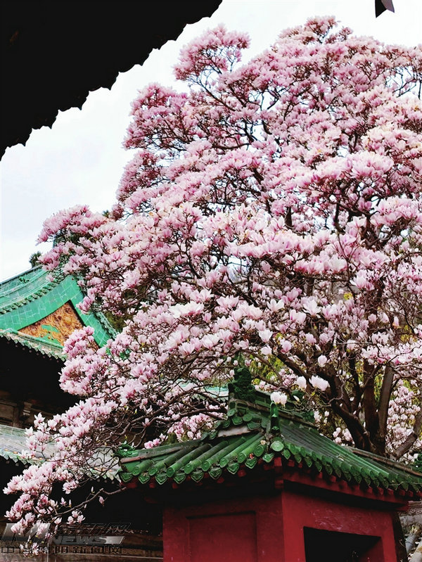 报恩寺内百年玉兰与古建相映。