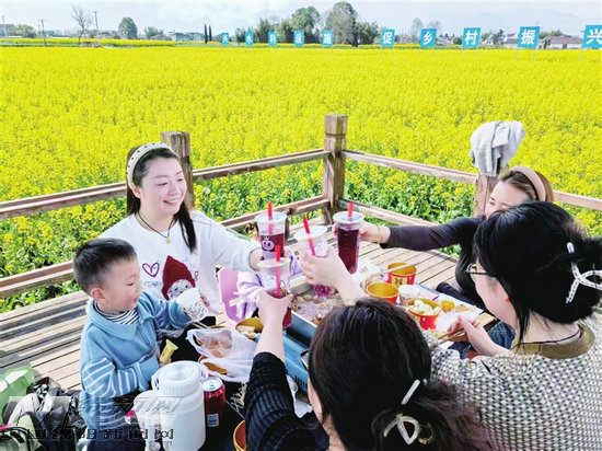3月13日,安州区第十届乡村文化和旅游消费季在秀水镇拉开帷幕,游客在特色美食区一边品尝美食,一边观赏春日美景。 记者 安峥 摄