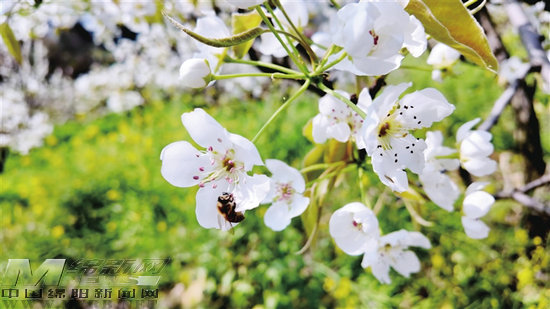 梨花盛放,蜜蜂在花间忙碌采撷春日芬芳。记者 尹秦 摄