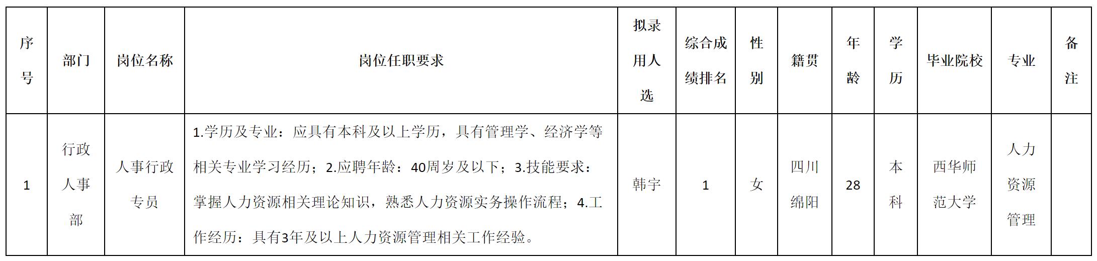 根据四川九华光子通信技术有限公司发布的招聘公告及招聘相关规定,经测试、考察、体检等程序,拟录用韩宇同志到四川九华光子通信技术有限公司工作,现予以公示,具体情况如下: