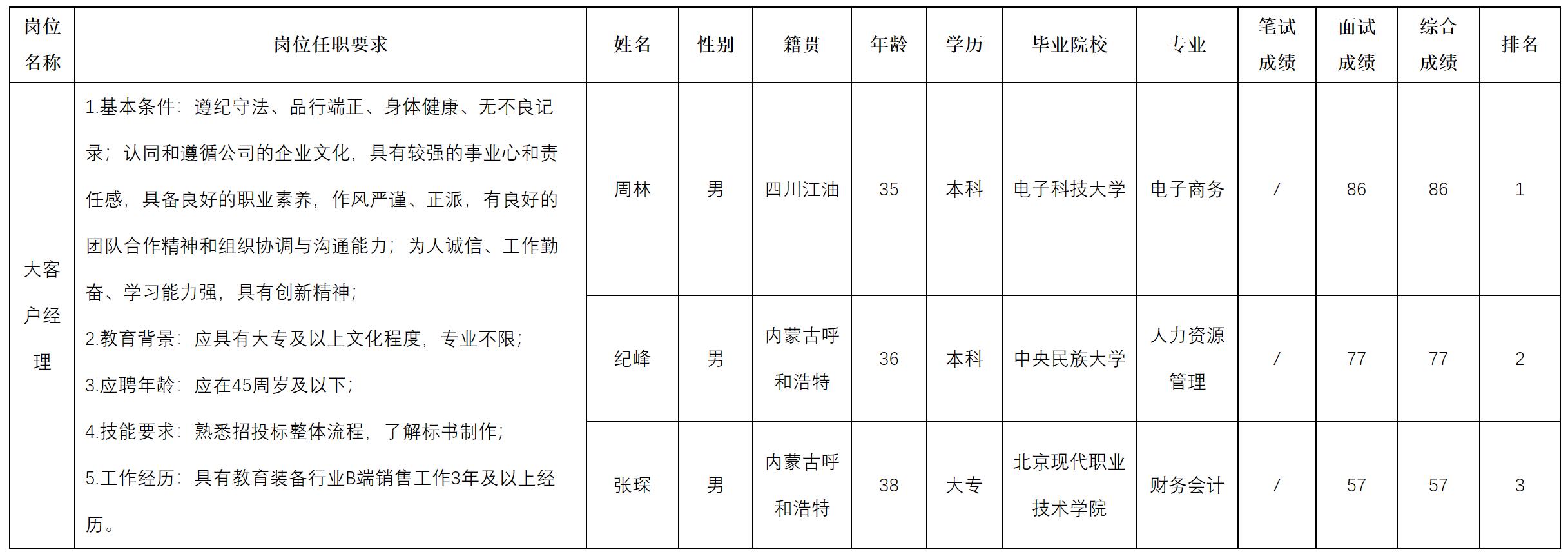 根据四川长虹教育科技有限公司发布的招聘公告及招聘相关规定,经面试等程序,现将面试成绩予以公示。