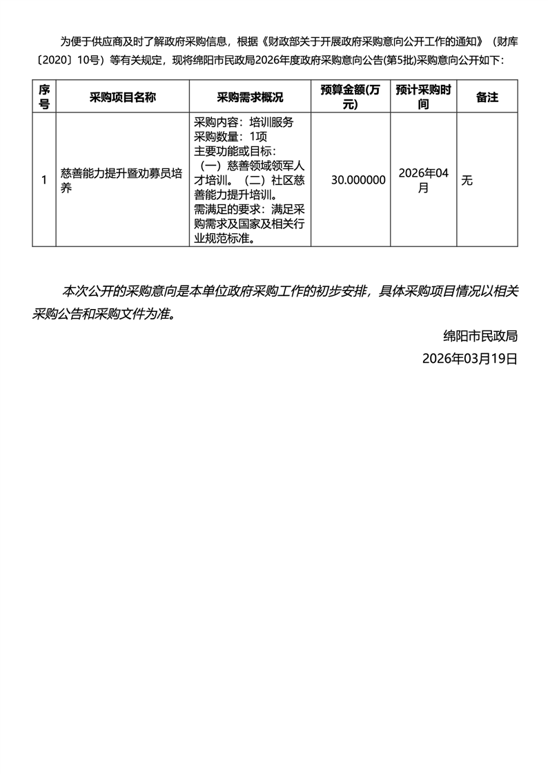 绵阳市民政局2026年度政府采购意向公告(第5批)