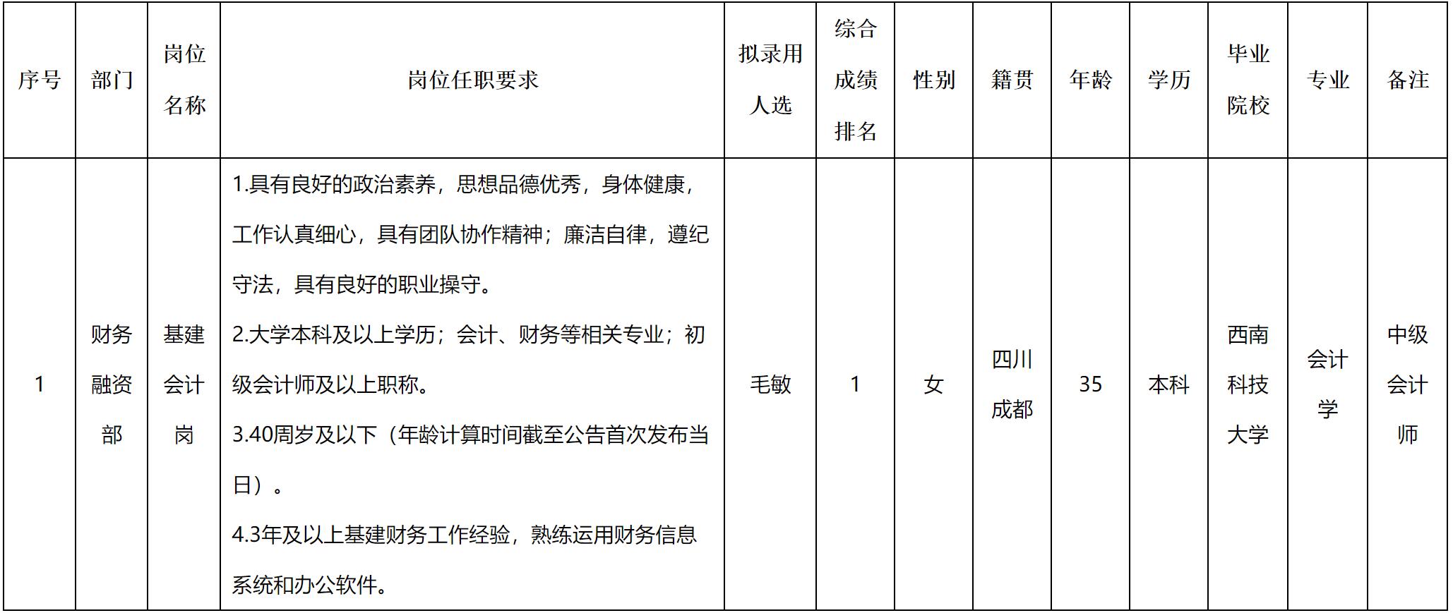 根据绵阳富达资产经营有限责任公司发布的招聘公告及招聘相关规定,经笔试、面试、背调、体检等程序,拟录用毛敏同志到绵阳富达资产经营有限责任公司工作,现予以公示,具体情况如下:
