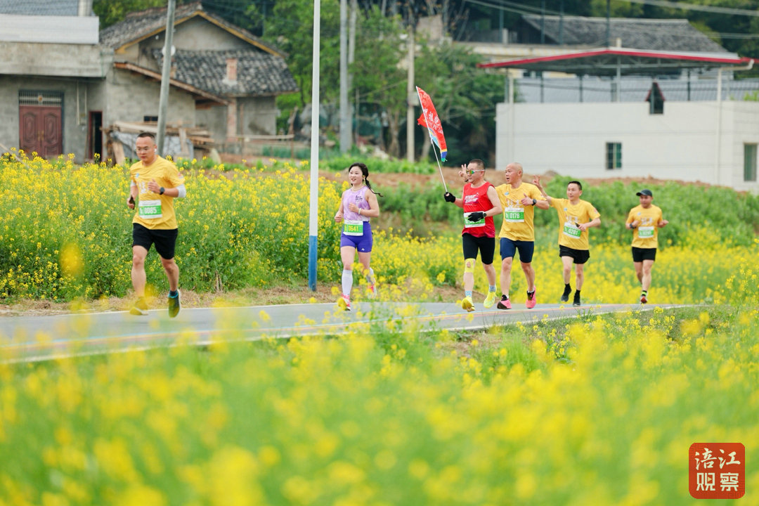 有人步履从容、匀速前行,有人高举队旗、奋力冲刺,更多人边奔跑边举起手机,定格路旁漫山遍野的金色花海。