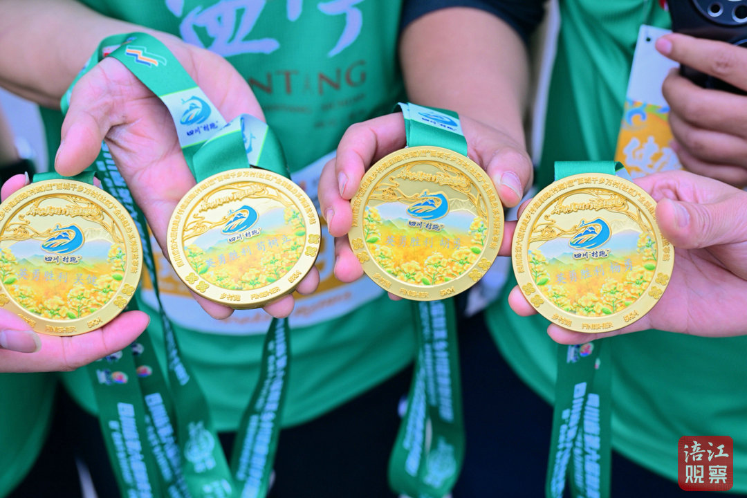 本次赛事参赛包内,绵阳米粉、桑叶茶、金孔小麻花、盐皮蛋等十余件物品,全是当地地道特产;完赛奖牌匠心设计,正面镌刻春日油菜花,背面融入嫘祖文化、字库塔、桑叶等盐亭元素,让跑者带走专属“盐亭记忆”。