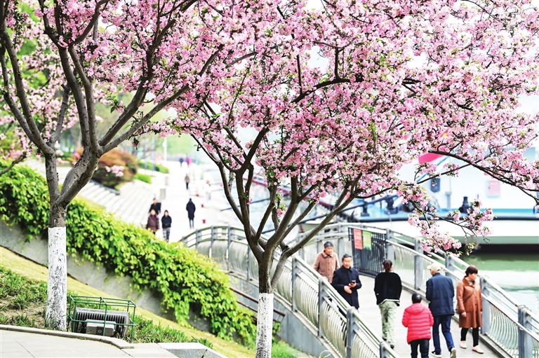 阳光穿透江畔的薄雾,温柔的春风裹挟着樱花特有的清甜,在江边步道弥漫开来。市民游客纷纷驻足,或悠闲赏景,或在树下定格最美瞬间,惬意地感受着春天的盎然生机。
