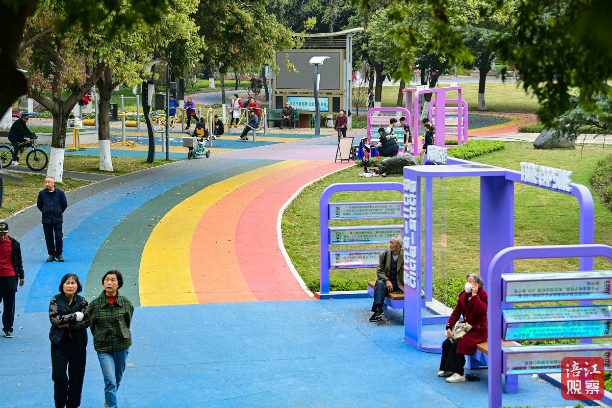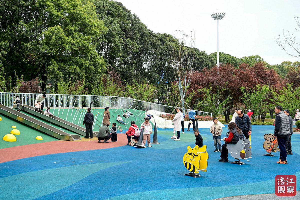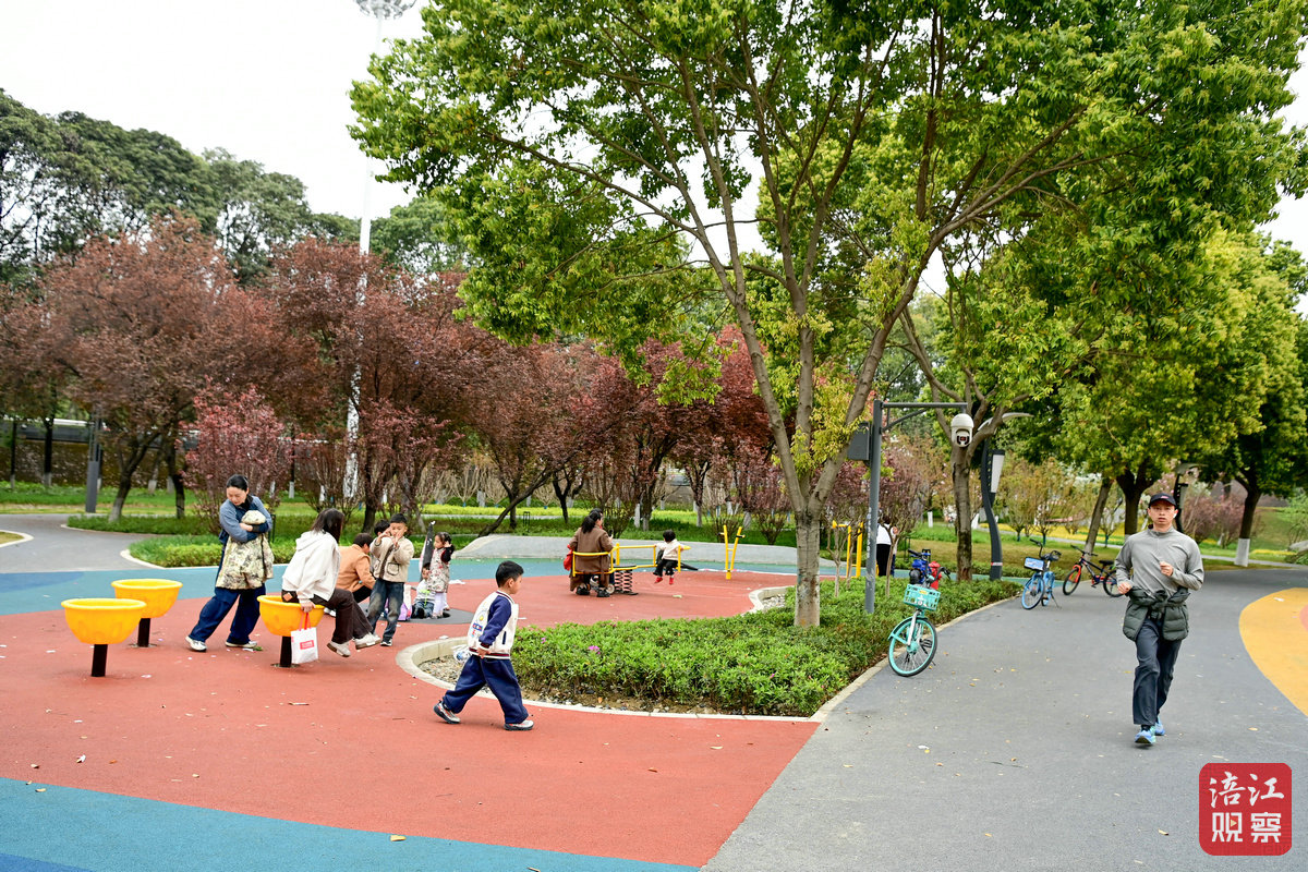 毗邻普明大桥桥头的彩色廊桥,将绵兴东路人行道与广场进行了有效衔接,为市民入园休闲锻炼带来诸多便利。蓝绿红三色交织、地面松软的儿童游乐场内,更是热闹非凡,随处可见孩子们快乐玩耍的身影。