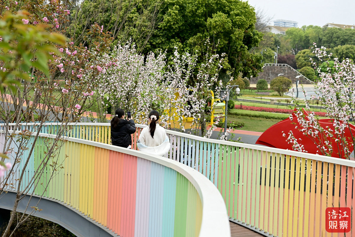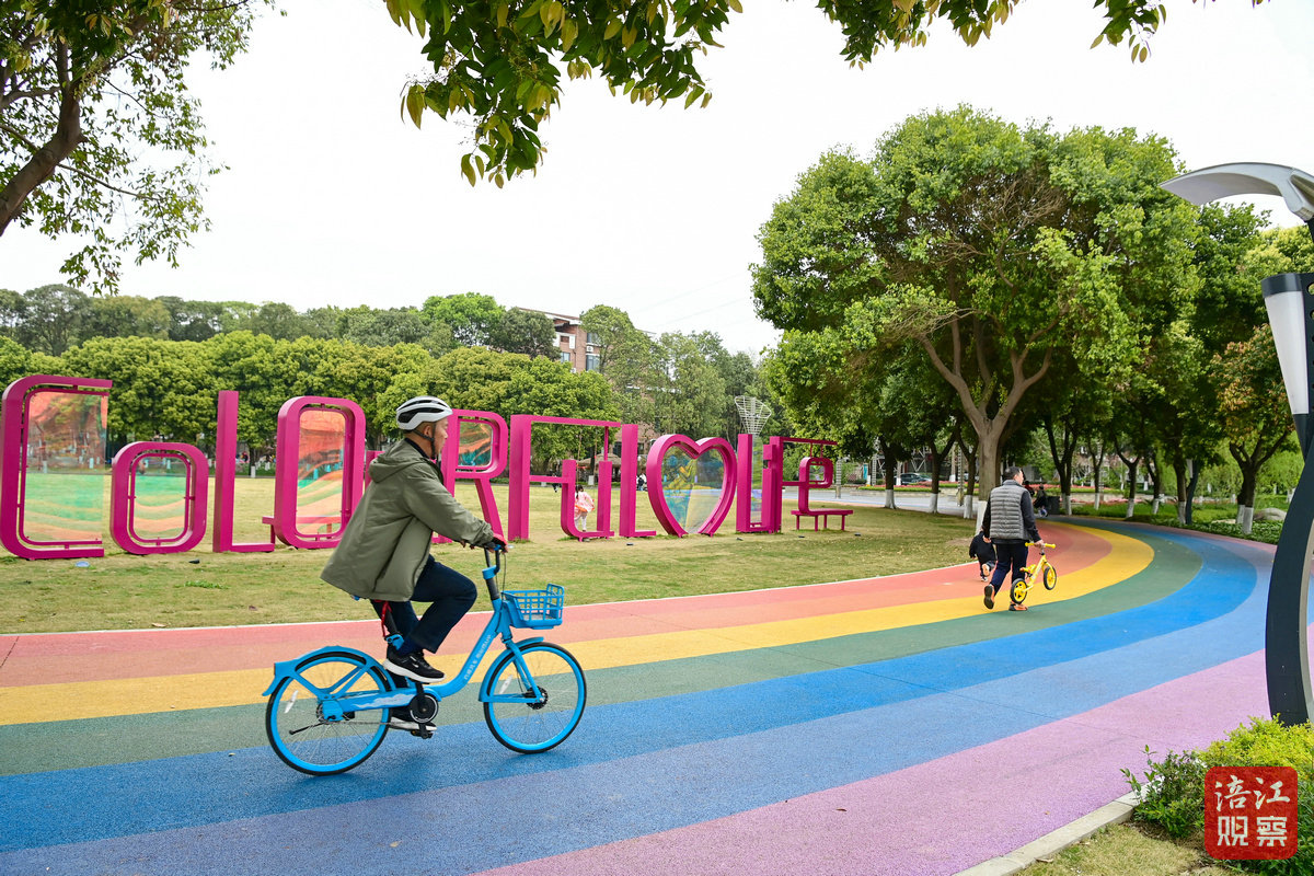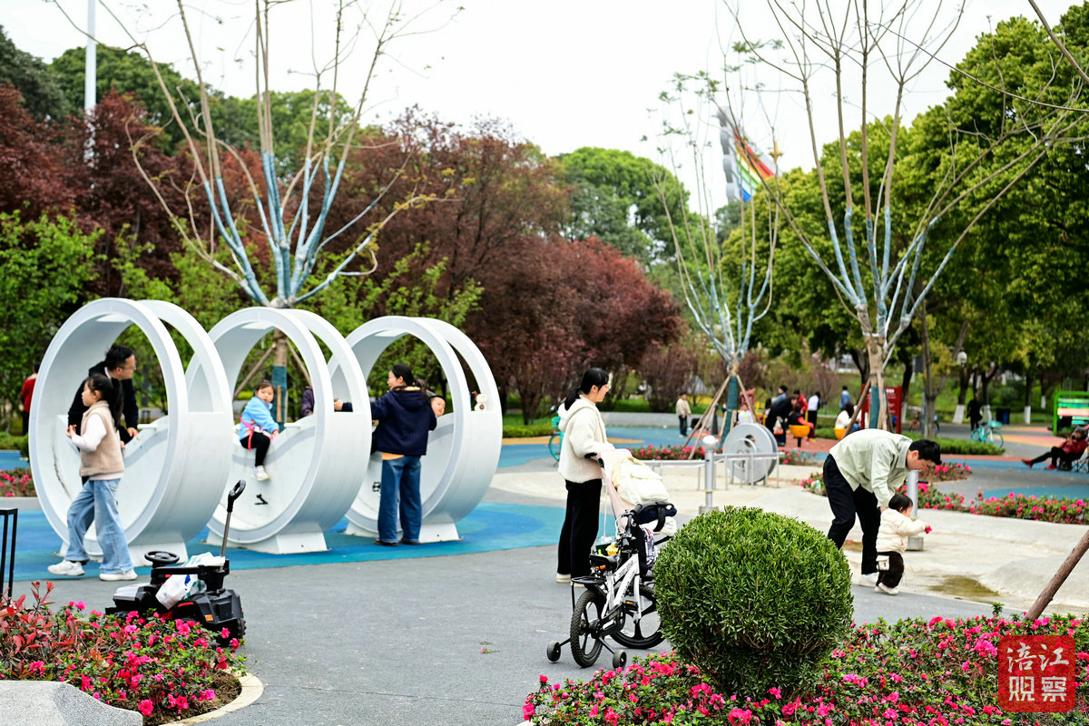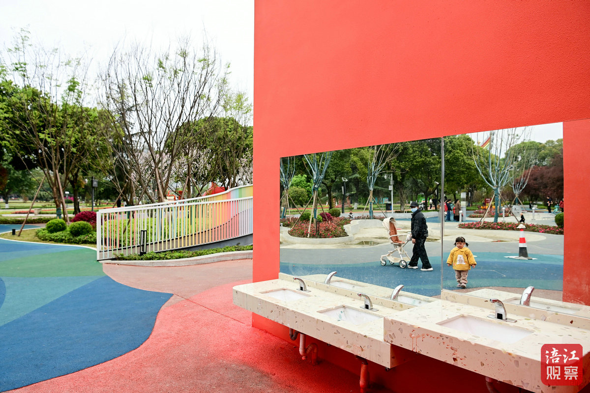 毗邻普明大桥桥头的彩色廊桥,将绵兴东路人行道与广场进行了有效衔接,为市民入园休闲锻炼带来诸多便利。蓝绿红三色交织、地面松软的儿童游乐场内,更是热闹非凡,随处可见孩子们快乐玩耍的身影。
