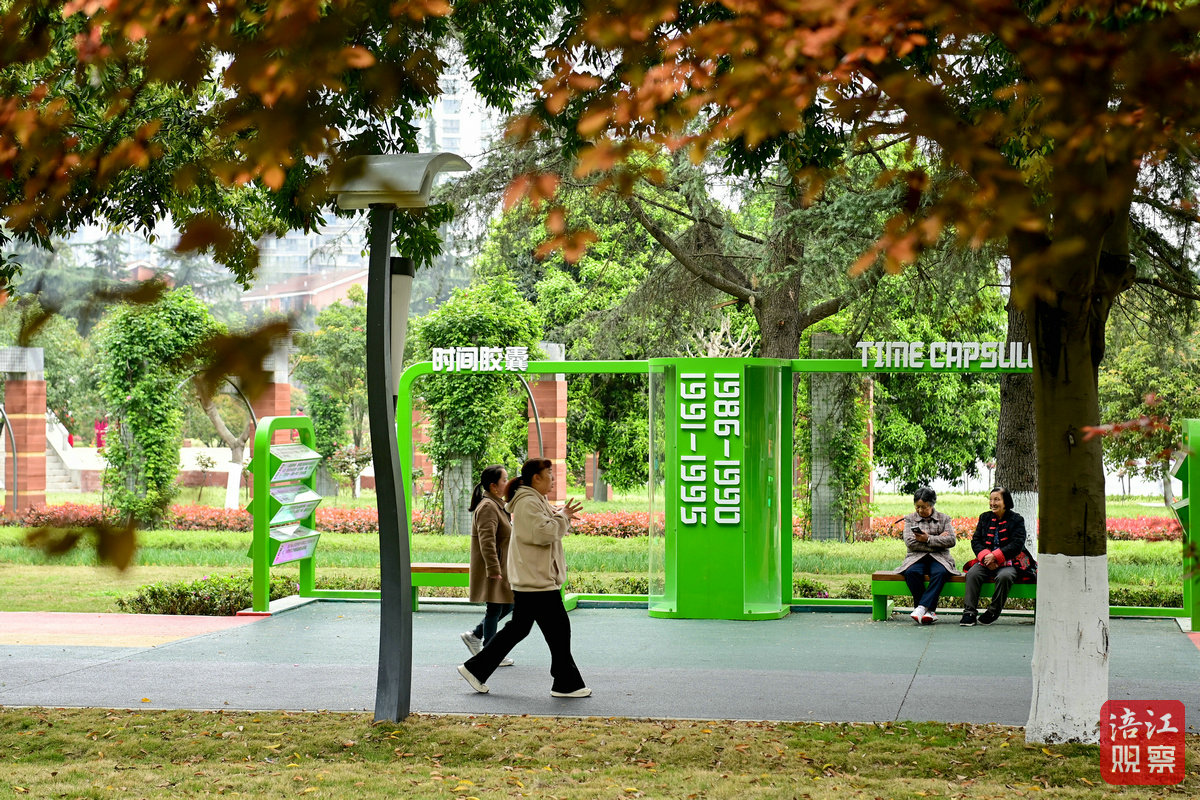 绿意葱茏的树植旁,彩虹步道尤如一条丝带,将健身区、游乐区串联起来;一处处美观舒适的“时间胶囊”公共座椅休憩区,巧妙融入了科技城建设发展大事记,让市民在歇脚的同时,还能品读科技城的创新精神。
