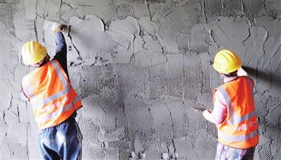 工人正在进行墙面抹灰作业。记者 王泽宇 摄