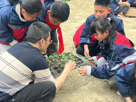 四年级的“小农夫”们在班主任的带领下,走进校内小菜园,亲手播种番茄、茄子等蔬菜。同学们小小的身影在菜园内来回穿梭,大家小心翼翼地把小菜苗放进土坑,扶正、填土、压实、浇水,每一步都藏着对菜苗的期待。
