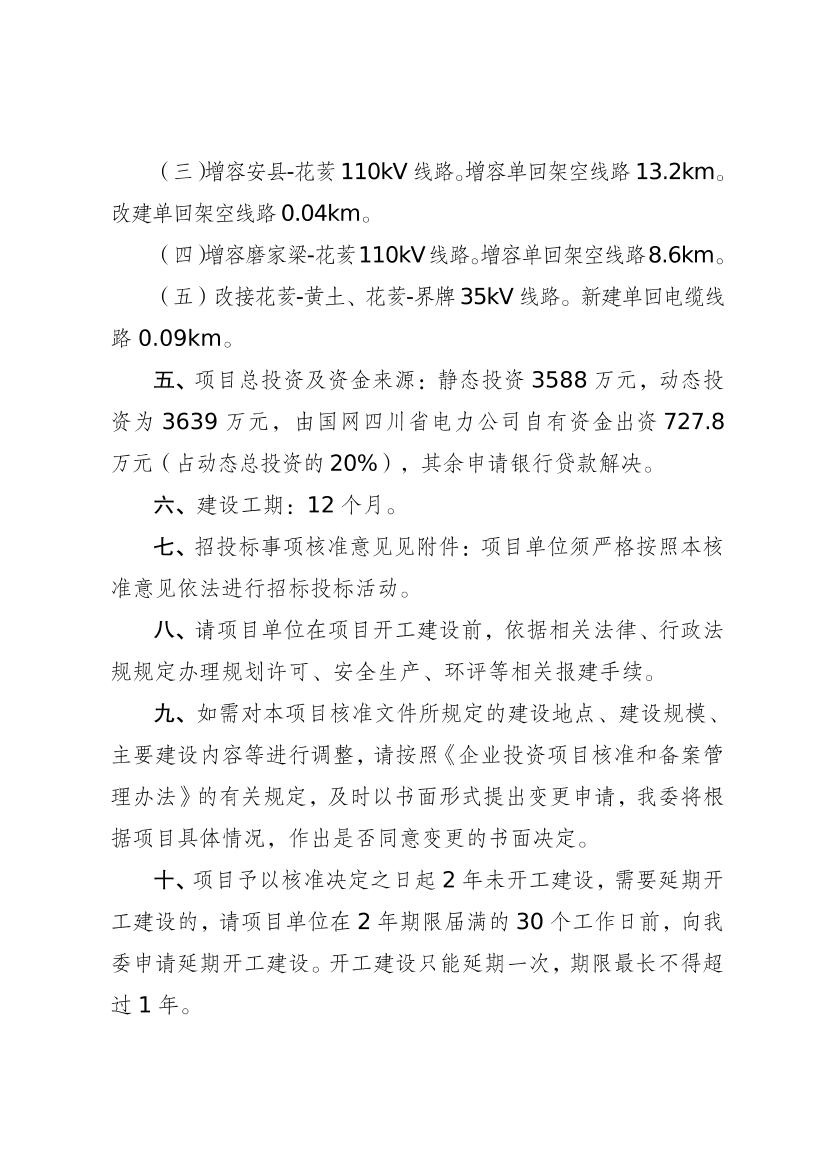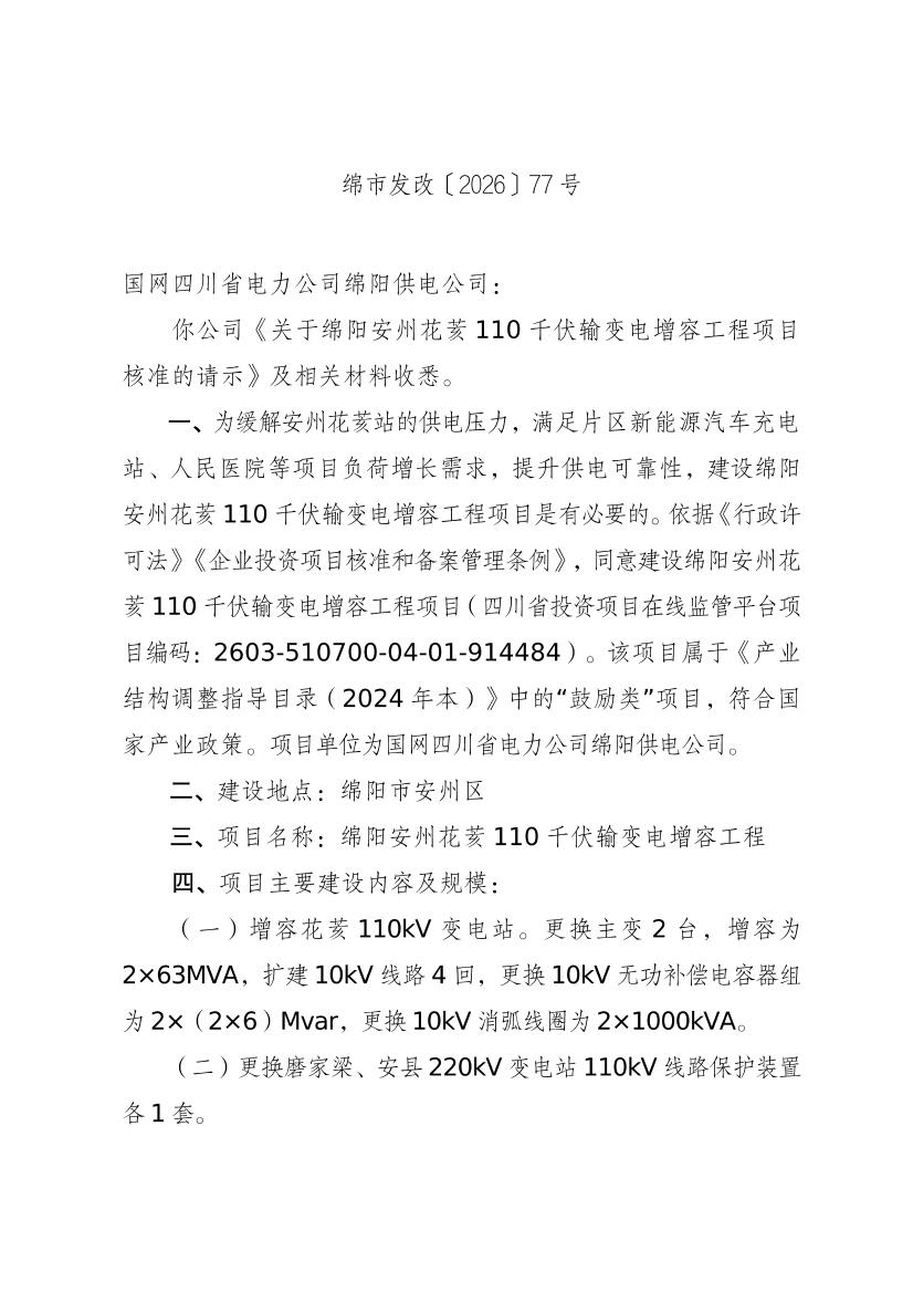 绵阳市发展和改革委员会关于绵阳安州花荄110千伏输变电增容工程项目核准的批复
