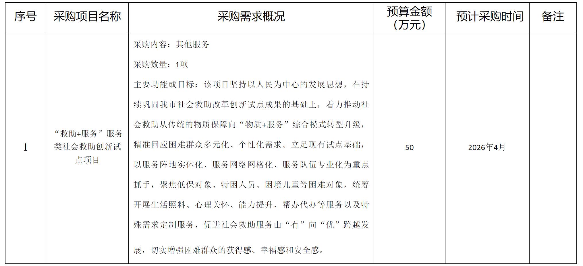为便于供应商及时了解政府采购信息,根据《财政部关于开展政府采购意向公开工作的通知》(财库〔2020〕10号)等有关规定,现将采购意向公开如下: 本次公开的采购意向是本单位政府采购工作的初步安排,具体采购项目情况以相关采购公告和采购文件为准。 绵阳市民政局 2026年3月20日
