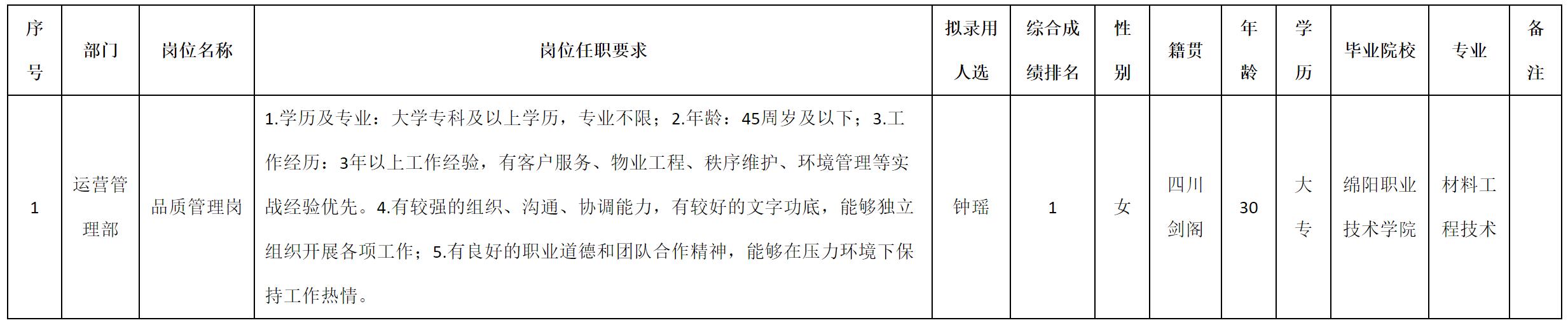 根据新疆九洲千城物业服务有限公司发布的招聘公告及招聘相关规定,经测试、考察、体检等程序,拟录用钟瑶同志到新疆九洲千城物业服务有限公司工作,现予以公示,具体情况如下: