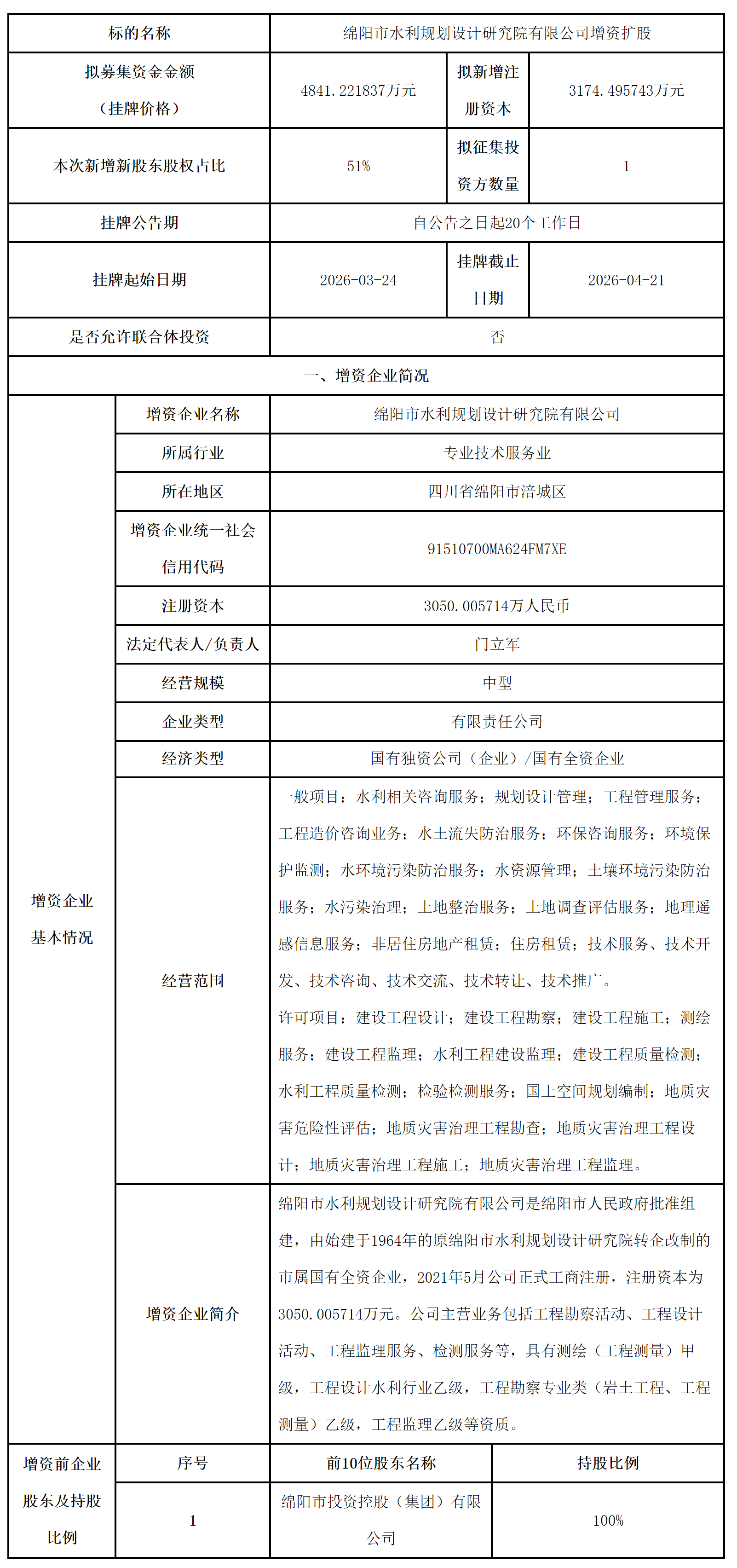 绵阳市水利规划设计研究院有限公司增资扩股