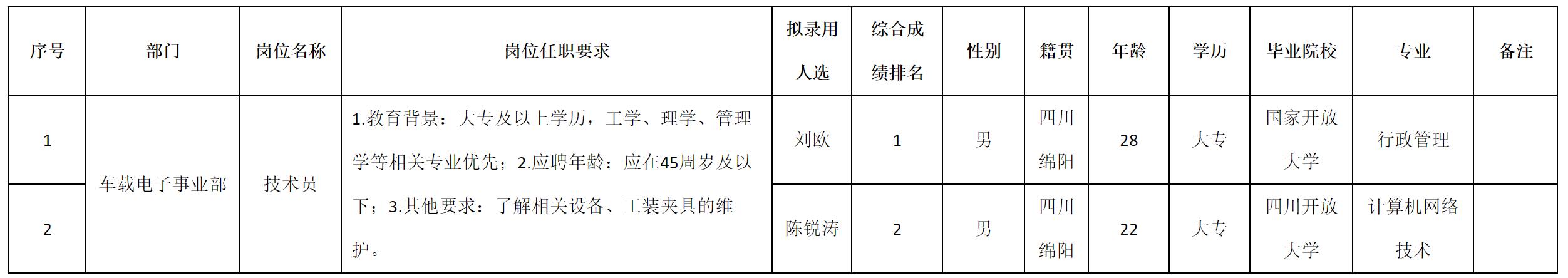 根据四川九州电子科技股份有限公司发布的招聘公告及招聘相关规定,经测试、考察、体检等程序,拟录用刘欧等2名同志到四川九州电子科技股份有限公司工作,现予以公示,具体情况如下: