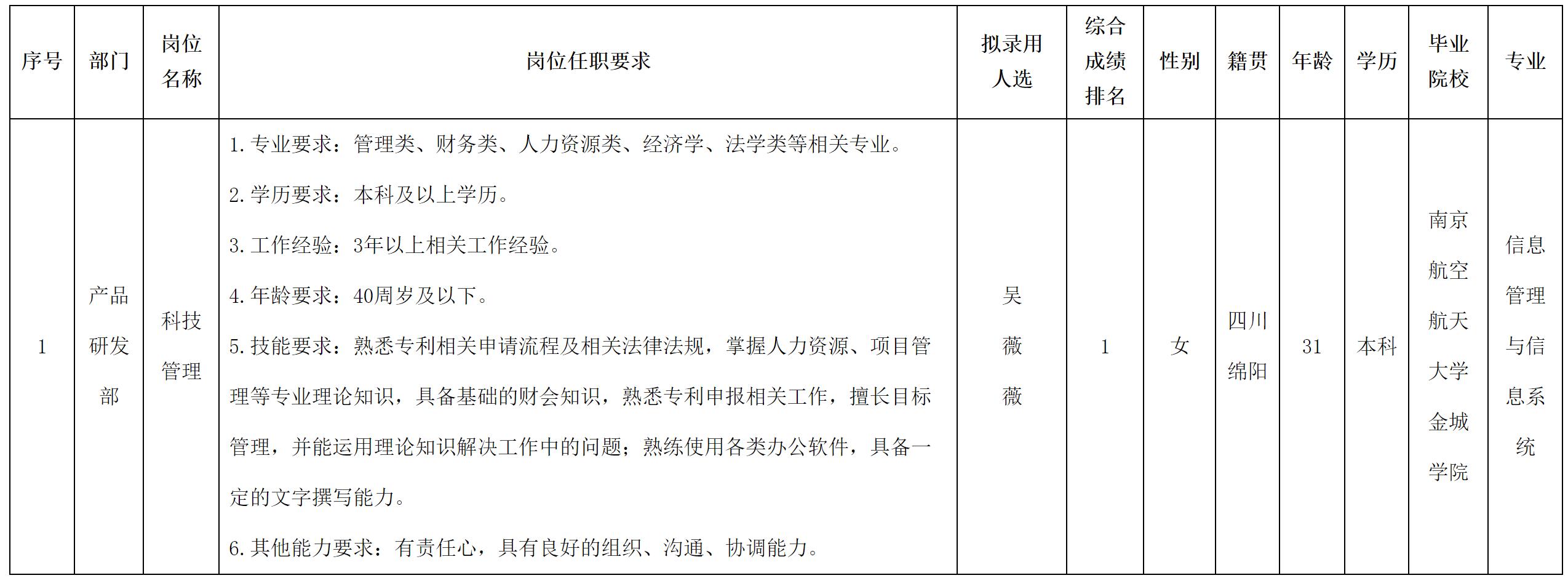 根据四川爱创科技有限公司发布的招聘公告及招聘相关规定,经面试、考察、体检等程序,拟录用吴薇薇同志到产品研发部工作,现予以公示,具体情况如下: