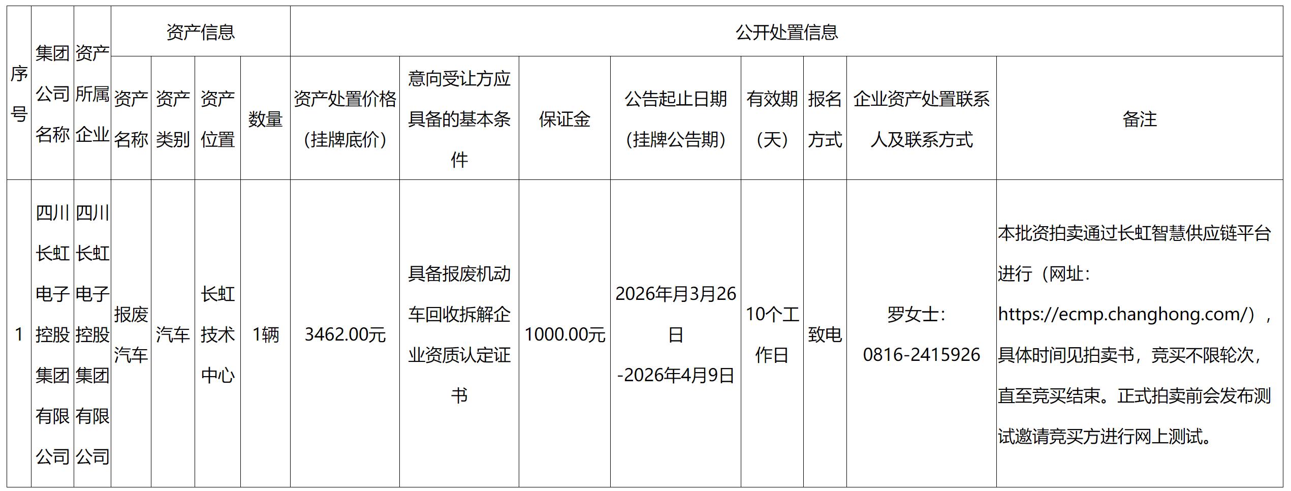 四川长虹电子控股集团有限公司资产处置公告