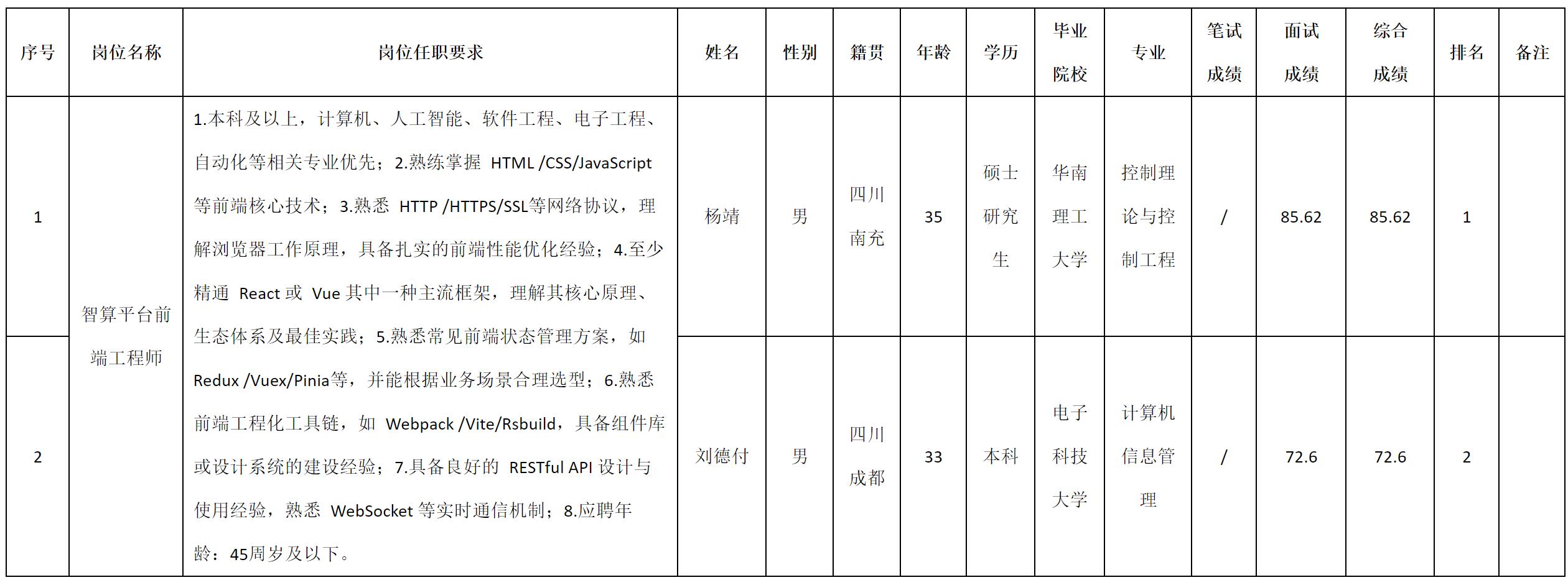 根据九洲集团成都创智融合科技有限公司发布的招聘公告及招聘相关规定,现将测试成绩予以公示。