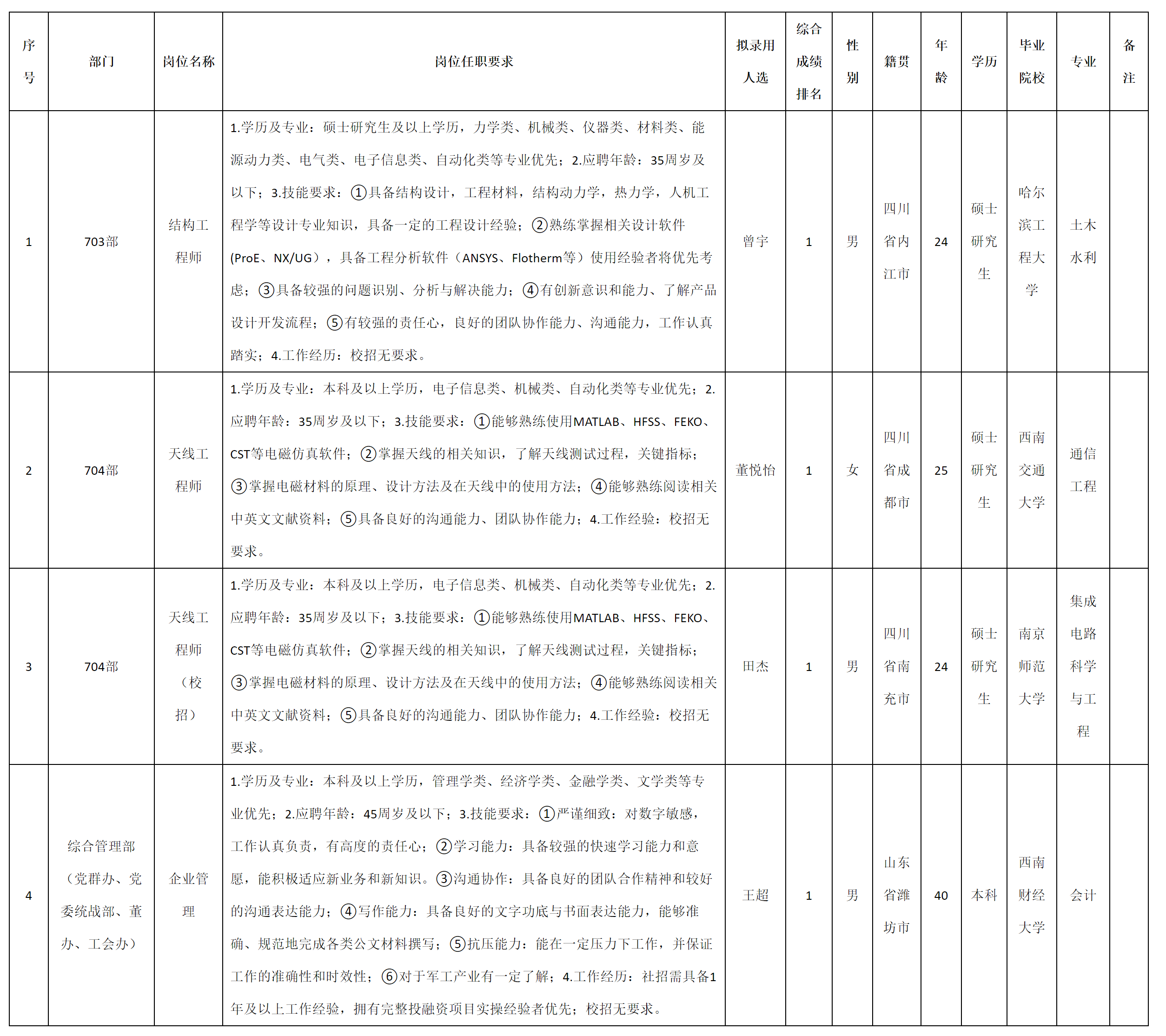根据四川九洲电器集团有限责任公司发布的招聘公告及招聘相关规定,经测试、考察、体检等程序,拟录用曾宇等4名同志到四川九洲电器集团有限责任公司工作,现予以公示,具体情况如下: