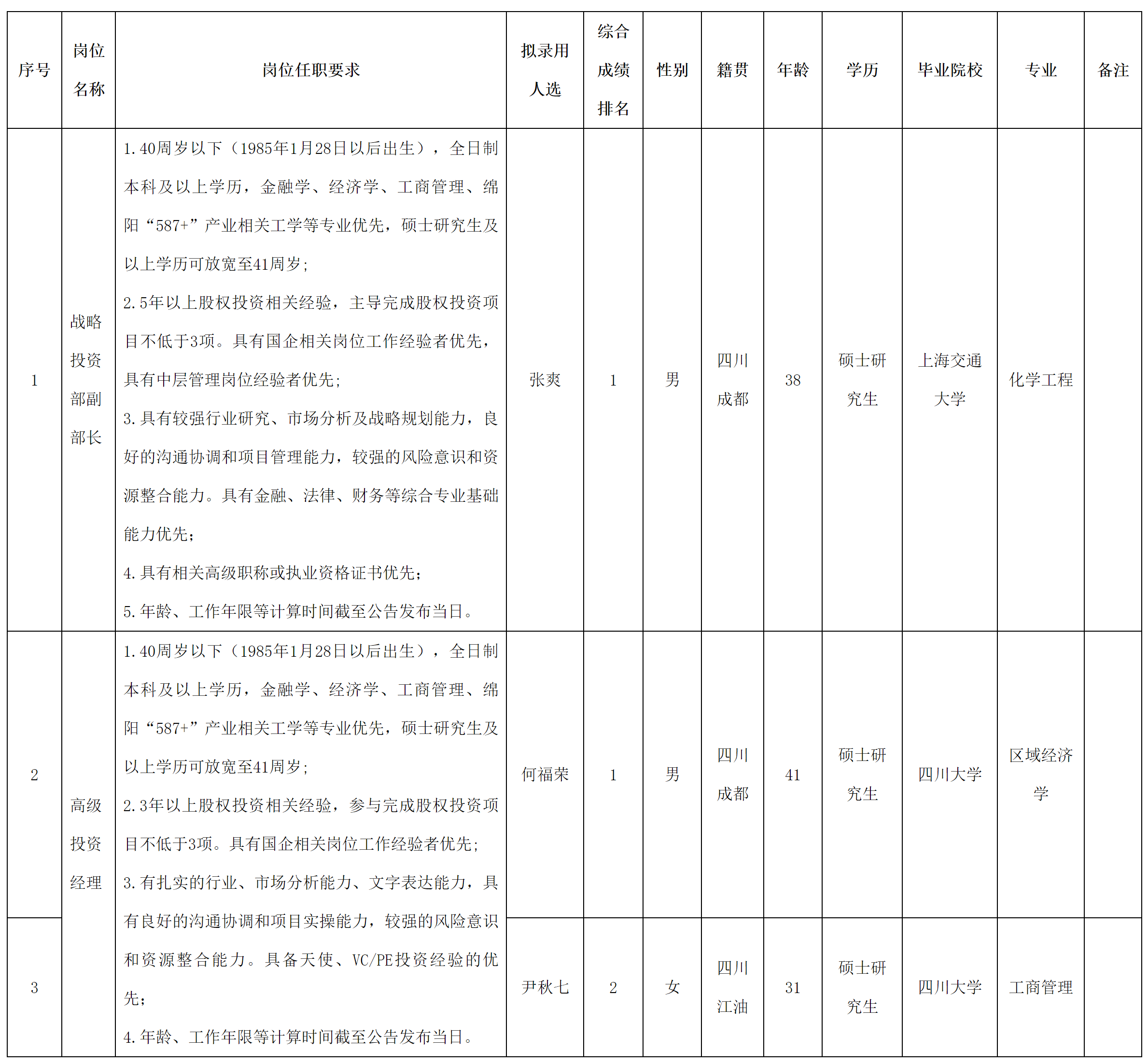 根据绵阳科技城科技创新投资有限公司发布的面向社会公开招聘战略投资部副部长等岗位的公告和招聘相关规定,经笔试、面试、考察、体检等程序,拟录用张爽等3位同志到绵阳科技城科技创新投资有限公司工作,现予以公示,具体情况如下: