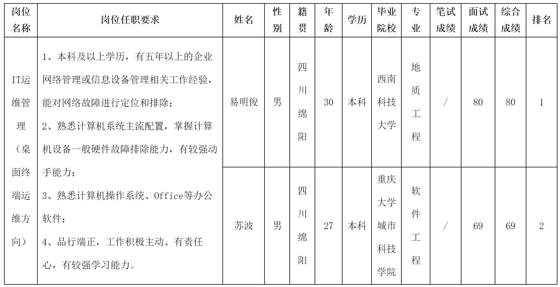 根据四川长虹电源股份有限公司发布的招聘公告及招聘相关规定,经面试等程序,现将测试成绩予以公示。