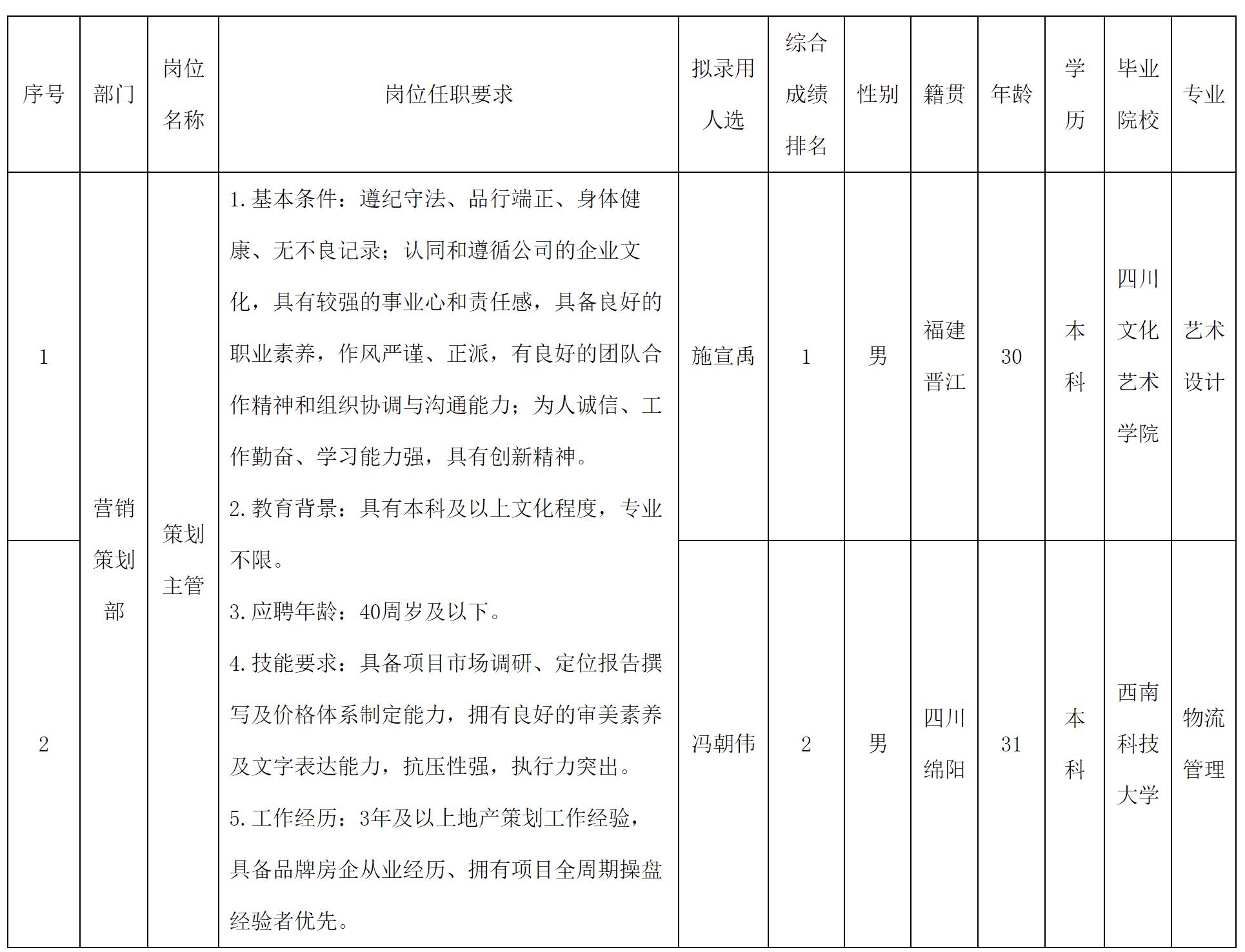 根据四川长虹置业有限公司发布的招聘公告及招聘相关规定,经面试、体检等程序,拟录用施宣禹等同志到公司工作,现予以公示,具体情况如下: