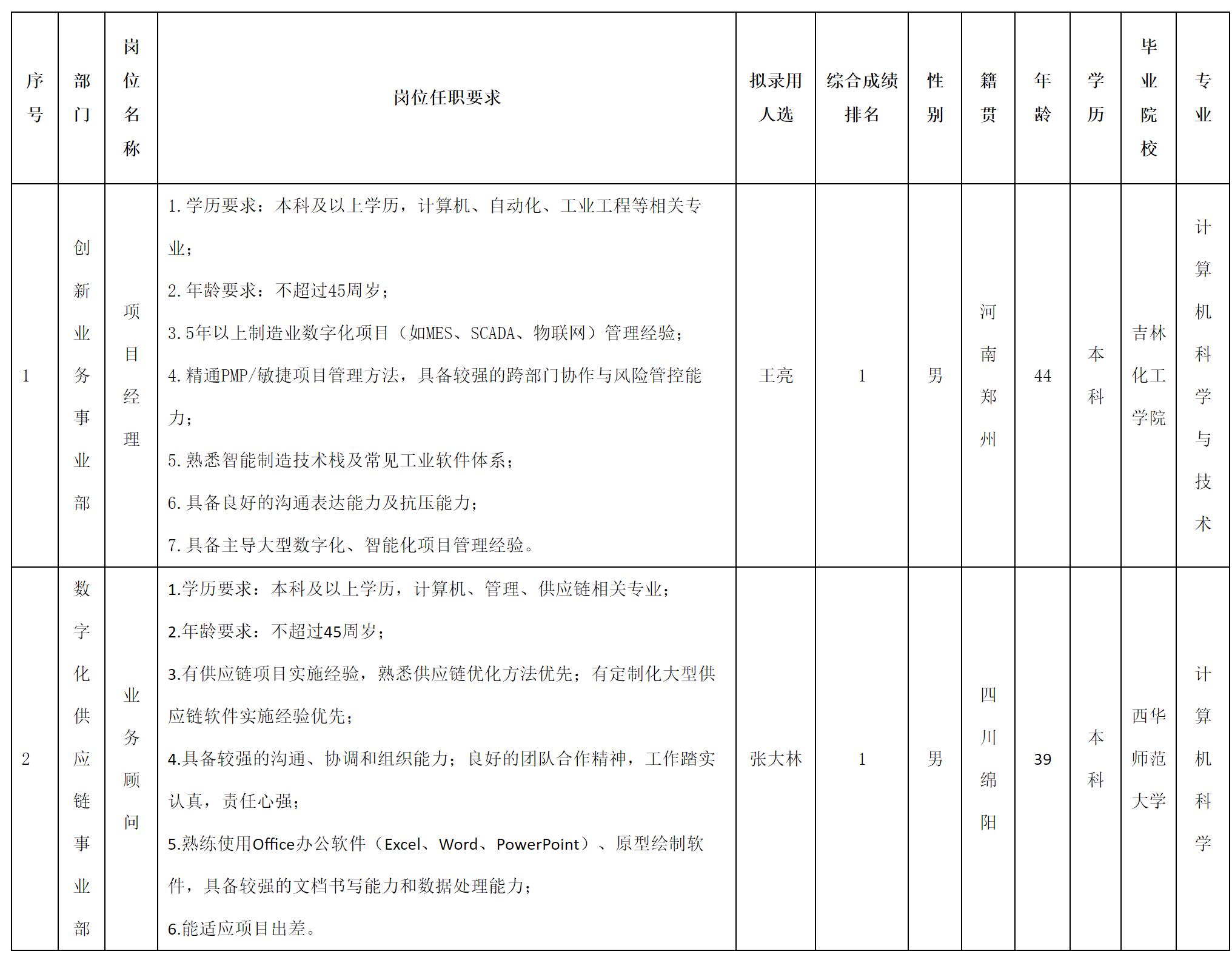 根据四川虹信软件股份有限公司发布的招聘公告及招聘相关规定,经测试、考察、体检等程序,拟录用王亮、张大林同志到四川虹信软件股份有限公司工作,现予以公示,具体情况如下: