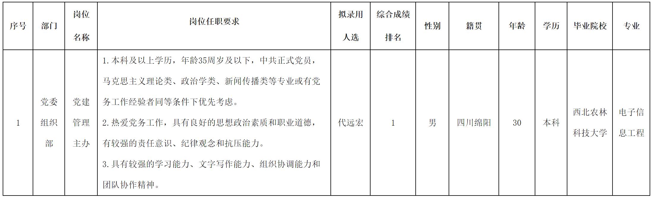 根据四川长虹电子控股集团有限公司发布的招聘公告及招聘相关规定,经测试、考察、体检等程序,拟录用代远宏同志到公司工作,现予以公示,具体情况如下:
