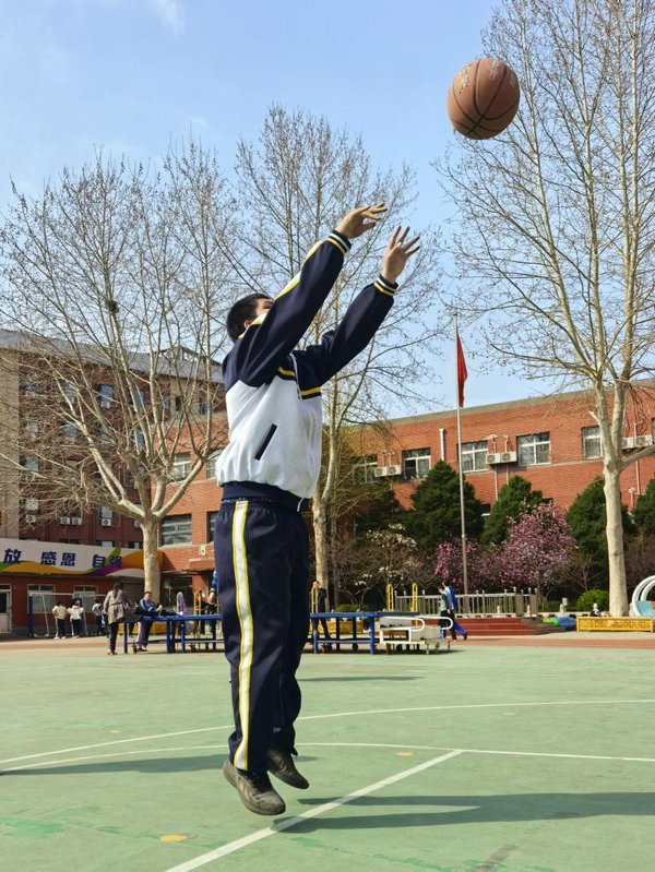 2026年3月,洋洋在北京他就读的学校操场打篮球。新华社发