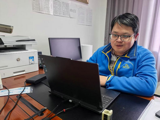 3月30日,杨乐通过黑颈鹤卫星跟踪数据管理系统查看迁徙情况。新华社记者蒋梦辰 摄
