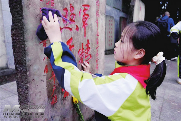 剑南路小学学生擦拭烈士墓碑。  游仙融媒供图