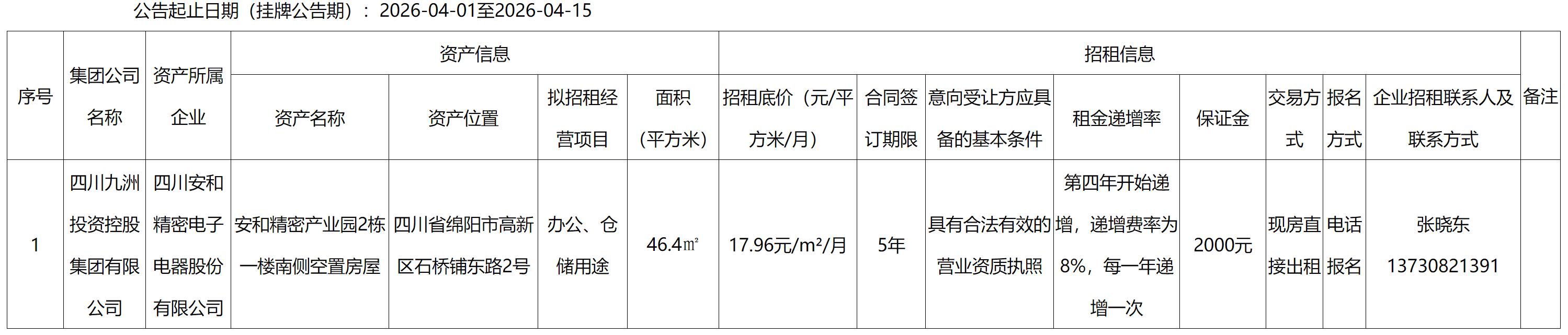 四川安和精密电子电器股份有限公司资产出租公告
