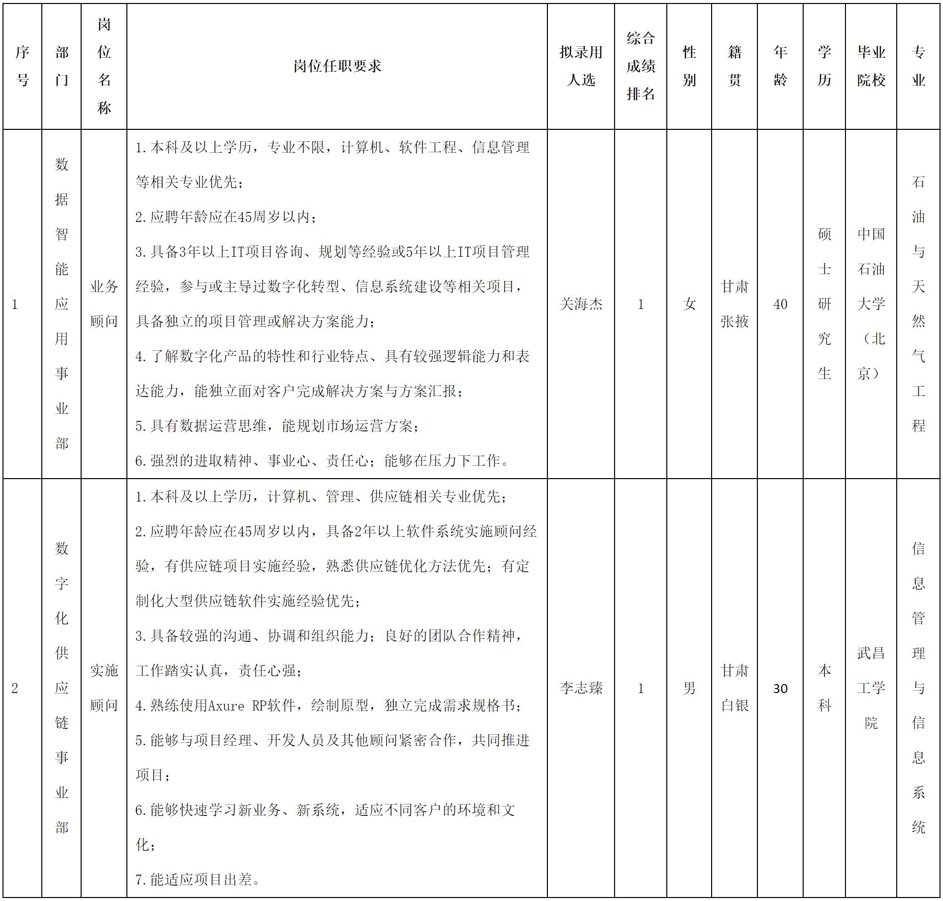 根据四川虹信软件股份有限公司发布的招聘公告及招聘相关规定,经测试、考察、体检等程序,拟录用关海杰、李志臻同志到四川虹信软件股份有限公司工作,现予以公示,具体情况如下: