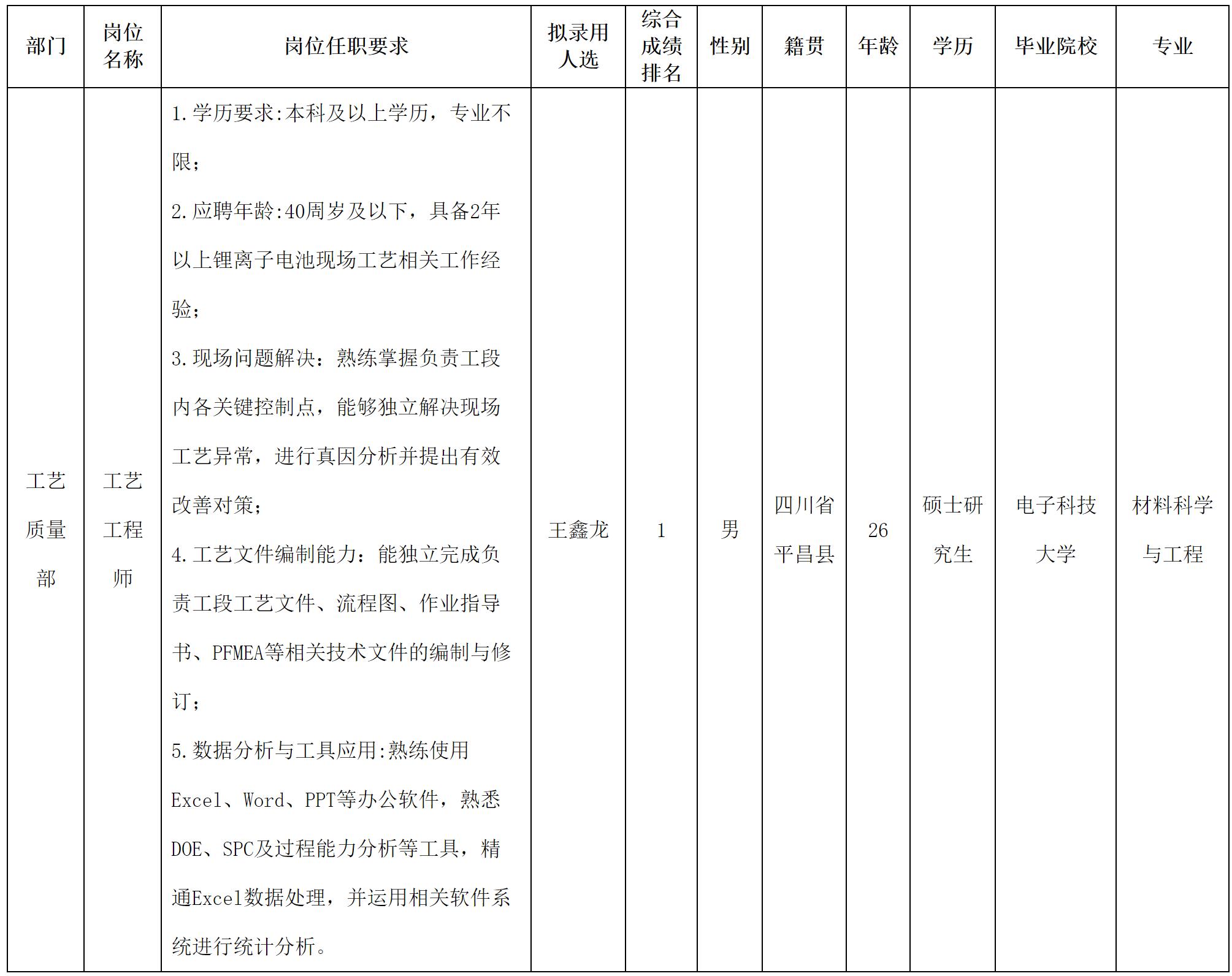 根据四川长虹杰创锂电科技有限公司发布的招聘公告及招聘相关规定,经面试、考察、体检等程序,拟录用王鑫龙同志到长虹杰创工作,现予以公示,具体情况如下: