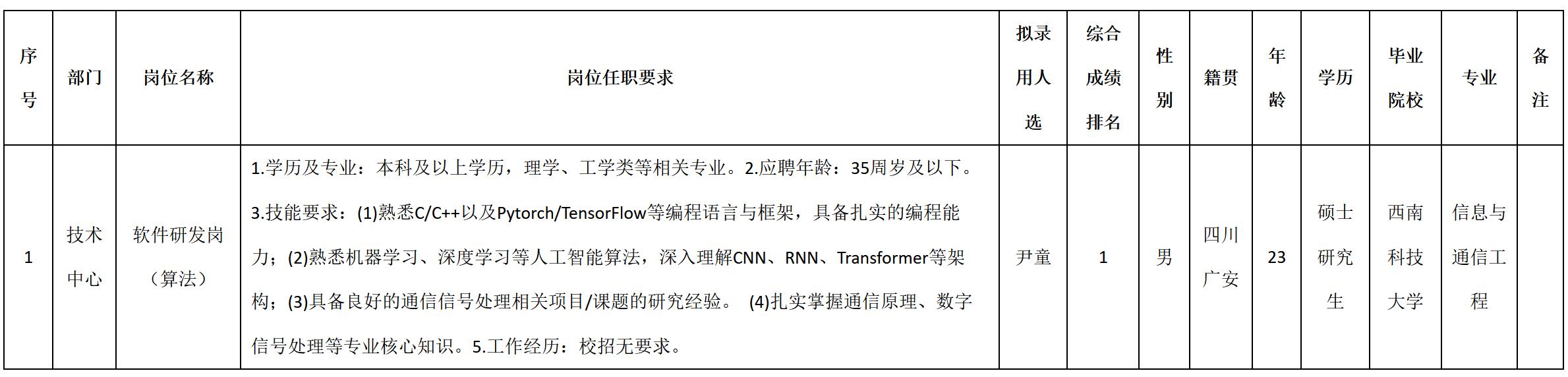 根据四川九强通信科技有限公司发布的招聘公告及招聘相关规定,经测试、考察、体检等程序,拟录用尹童同志到四川九强通信科技有限公司工作,现予以公示,具体情况如下: