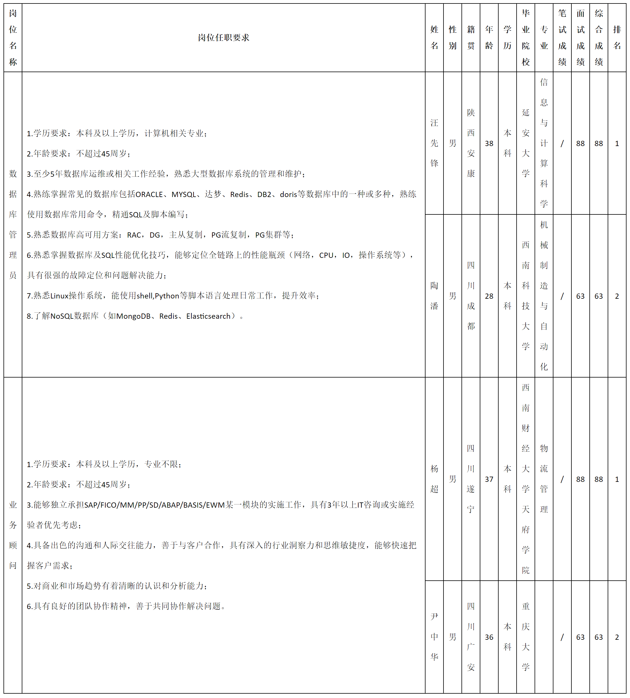 根据四川虹信软件股份有限公司发布的招聘公告及招聘相关规定,经面试等程序,现将测试成绩予以公示。