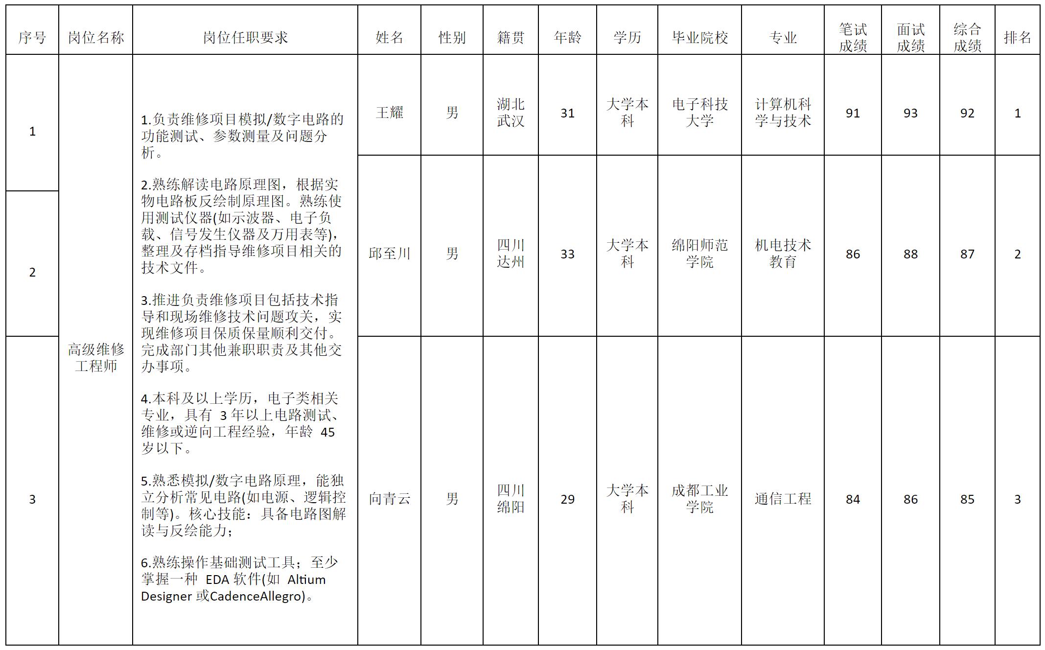 根据四川长虹电子科技有限公司发布的招聘公告及招聘相关规定,经笔试、面试等程序,现将测试成绩予以公示。