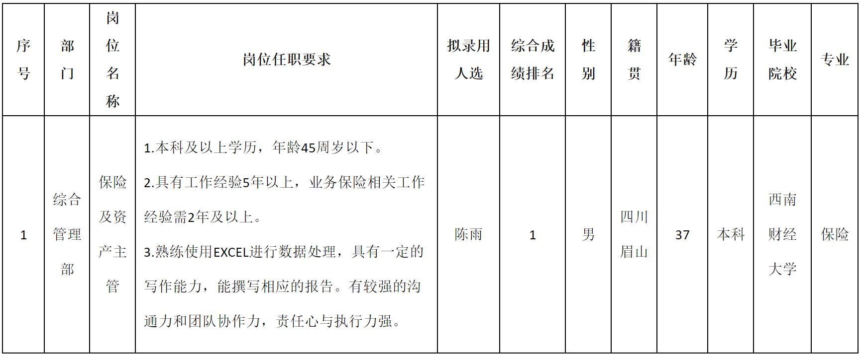 根据四川长虹民生物流股份有限公司发布的招聘公告及招聘相关规定,经面试、考察、体检等程序,拟录用陈雨同志到四川长虹民生物流股份有限公司工作,现予以公示,具体情况如下: