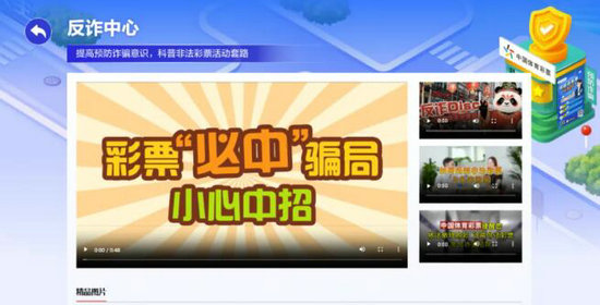 场景四:反诈中心。非法彩票?骗局套路?统统退下,这里给你一双“火眼金睛”!这是你的专属“防骗盾牌”,帮助你识别各类的非法彩票和骗局套路,帮助你学会应对方法,守护你的购彩资金安全。