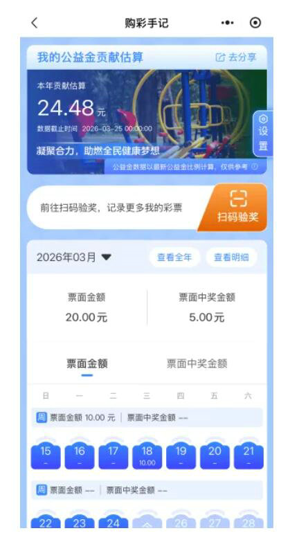 场景五:购彩手记。买一张彩票能为公益事业贡献多少?这是你的私人购彩日记,可以清晰地记录每一次购彩轨迹,直观感受自己为公益做出的贡献。让购彩有迹可循、有温暖可回味。