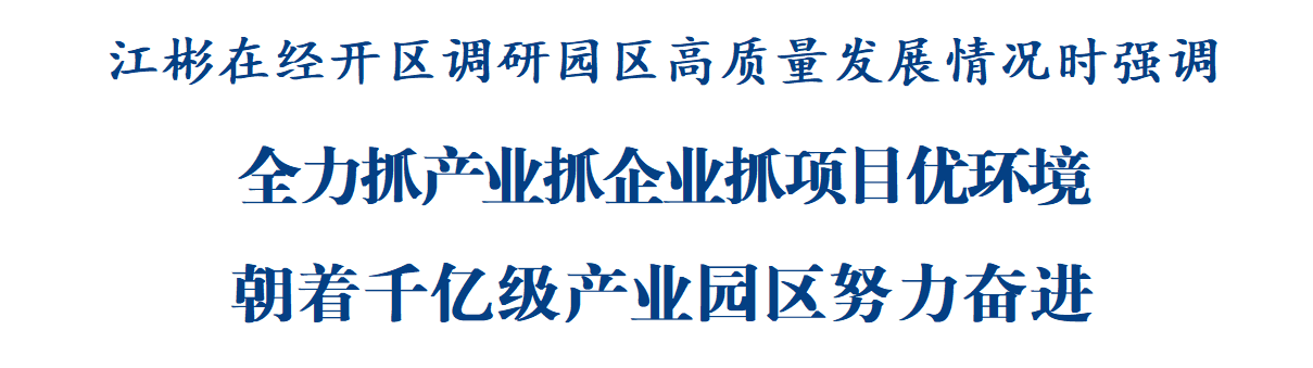 调研中,江彬在听取经开区发展情况汇报后指出,经开区区位条件好、产业基础实,也有化工园区这一项目招引的宝贵资源条件,要充分发挥自身比较优势,抓实抓好项目投资、企业培育、产业壮大等工作,加快建成千亿级产业园区。要突出需求导向、市场导向,健全科技成果转化“挖矿寻宝”机制,推动高能级创新平台扩量提质,不断提升科技成果转化和产业化质效。要推动产业建圈强链提质增效,深化产业链延链补链招商,推动存量企业“老树发新枝”,推动重点优势产业聚链成群、量质齐升。要推动发展环境持续优化,承接用好“两新两度”等试点机遇,持续深化改革激活园区干事创业活力,打造一流开放平台和营商环境,不断完善城市功能品质,营造高质量发展的良好环境。