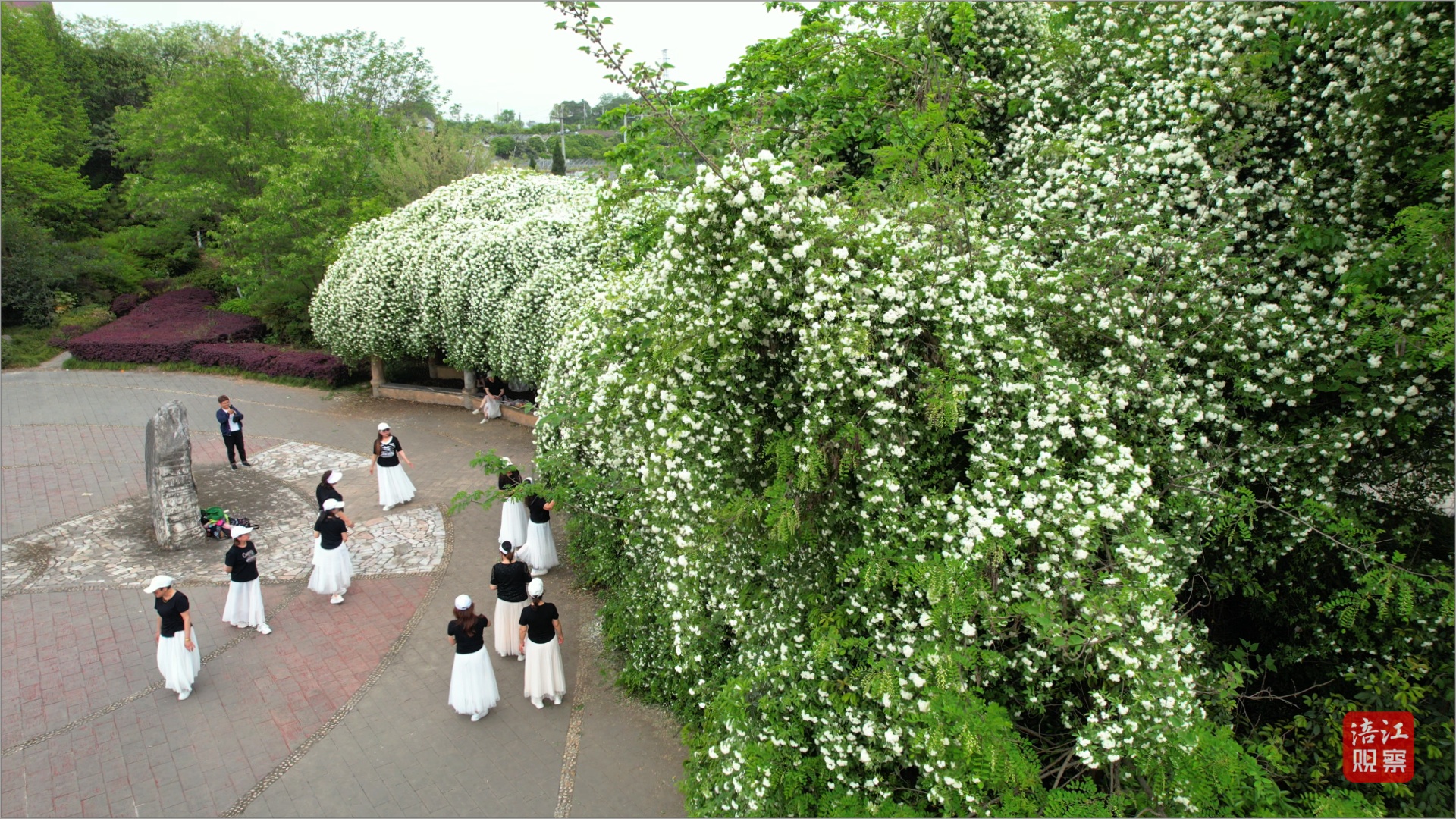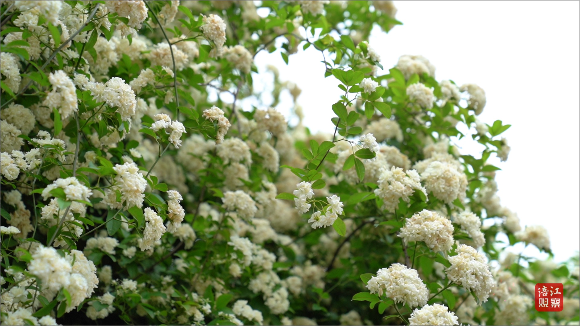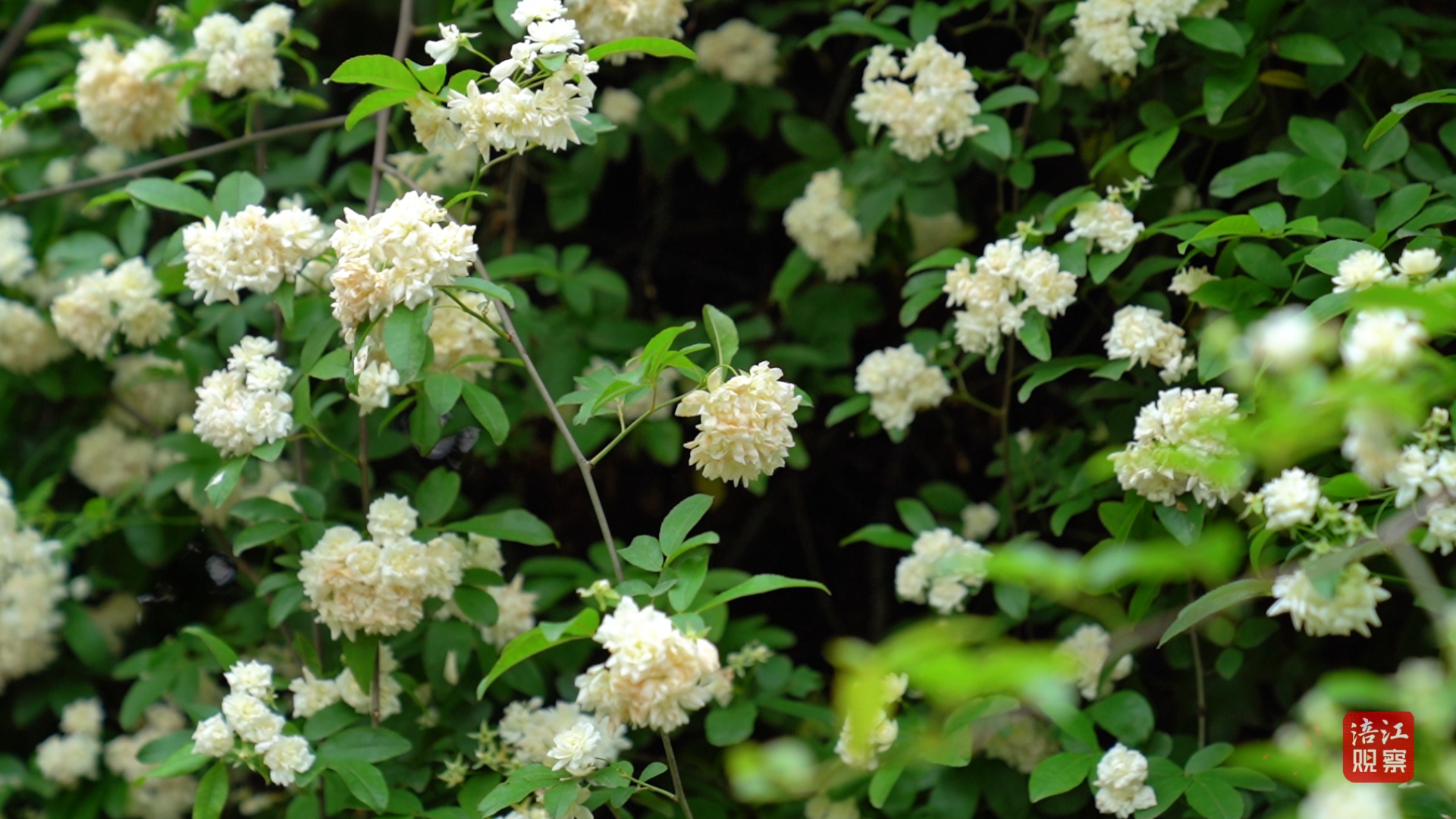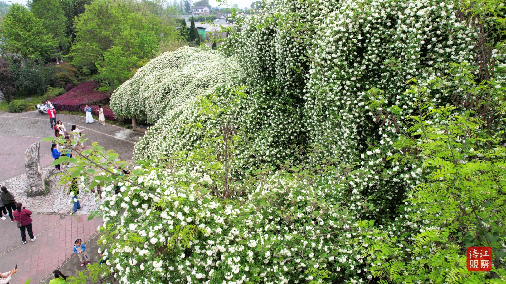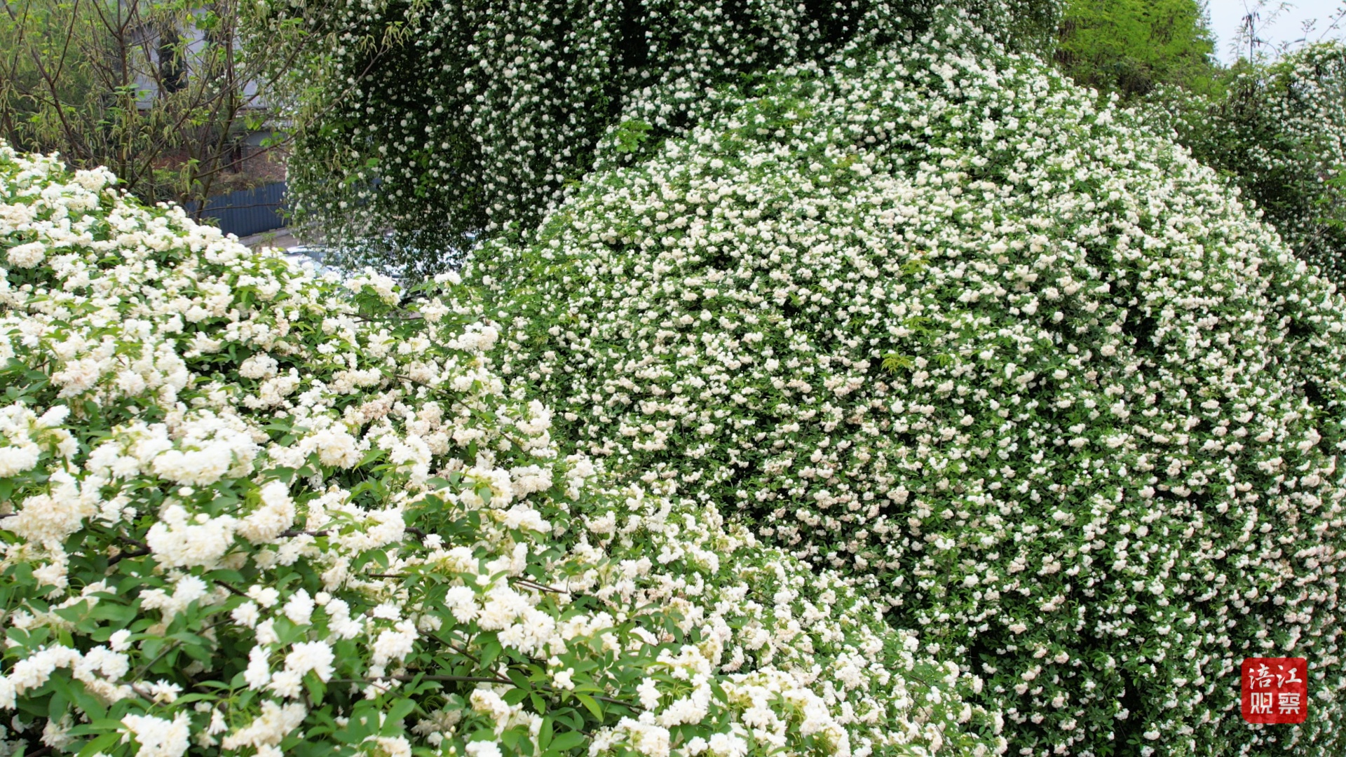 清明时节,春和景明,绵江大道李白故居青莲武家坡路旁,景观回廊爬满了洁白小花,宛若瀑布倾泻而下,浓郁的花香四溢,一如花名“七里香”,吸引了众多游客前来打卡拍照。