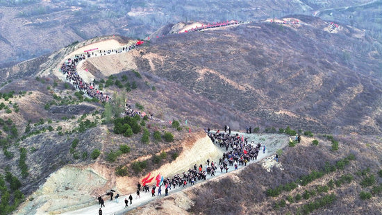 红军长征“胜利之山”六盘山脚下的宁夏固原市是革命老区。固原二中和弘文中学两所学校清明节徒步百里祭英烈活动,至今已坚持了31年。图为4月3日,参加徒步祭英烈活动的师生翻越黄峁山。新华社记者 王鹏 摄