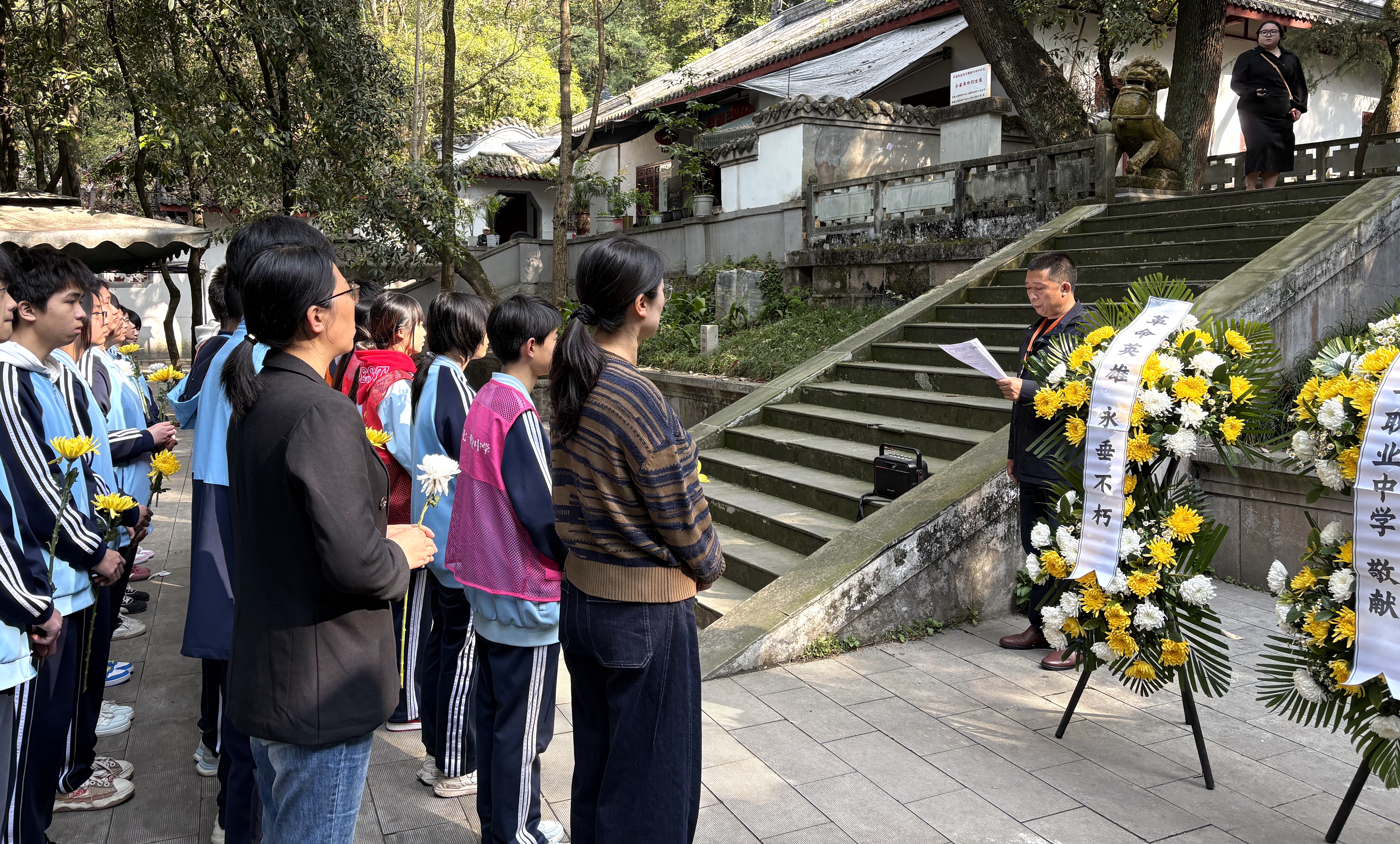 党员思政课教师陈世勇,以现场教学的形式,为全体师生带来一堂沉浸式红色思政课。陈老师立足烈士陵园的红色沃土,结合本地革命英烈的英勇事迹,深情讲述了革命先辈们在战火纷飞的年代里,为民族独立、人民解放抛头颅、洒热血,不畏强敌、浴血奋战、舍生取义的感人故事,细致解读了英烈精神的时代内涵。他勉励同学们,要从北川抗震救灾精神中汲取奋进力量,铭记历史、不忘初心,把爱国情、强国志、报国行融入日常学习生活,以实际行动传承红色血脉,扛起新时代青少年的责任与担当。
