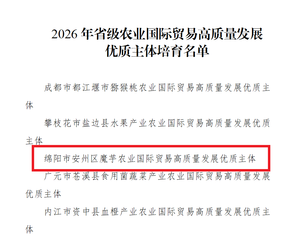 近日,四川省农业农村厅发布了《关于2026年省级农业国际贸易高质量发展优质主体培育名单的公示》。其中,安州魔芋作为绵阳市唯一代表,成功入选。这不仅是对安州魔芋产业实力与品牌潜力的权威认可,更让其在迈向国际市场的征程上占据了先机。