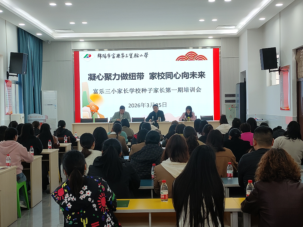 为了深化家校协同育人机制,凝聚教育合力,3月25日下午,绵阳市富乐三小家长学校召开了以“凝心聚力做纽带 家校同心向未来”为主题的2026年春种子家长第一期培训会。